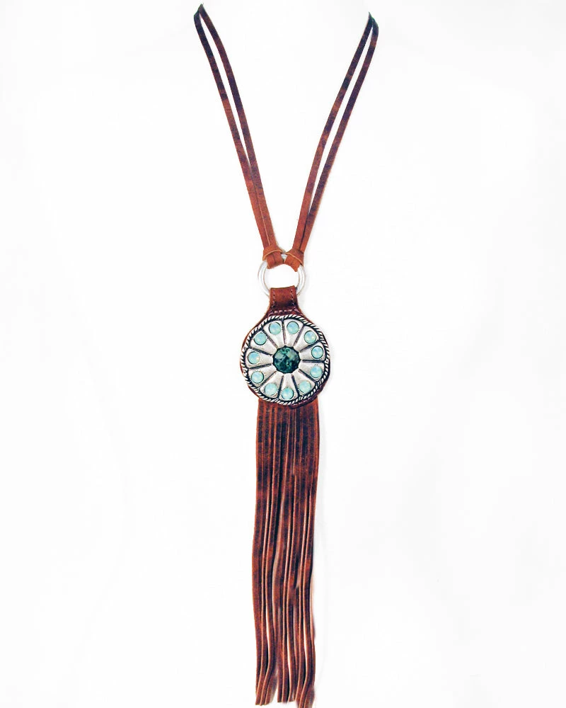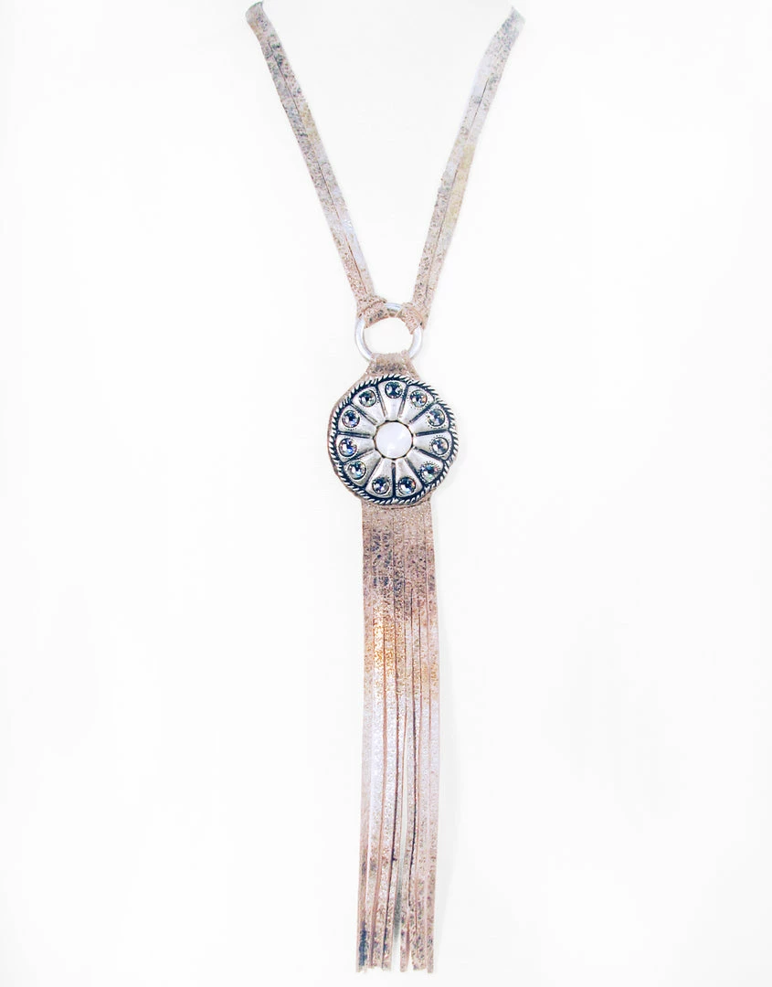 This necklace features a central flower pendant with long fringe to finish the look.Â
