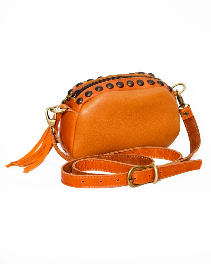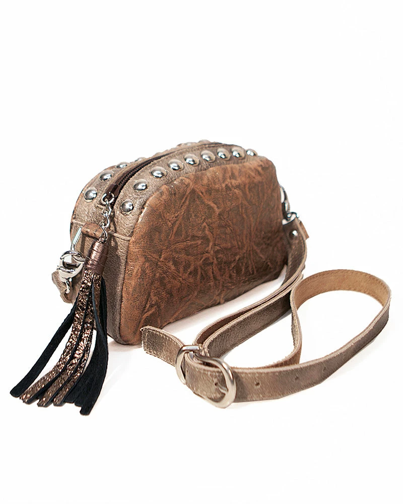 Large polished studs and a playful tassel add a fresh twist to the classic camera bag.