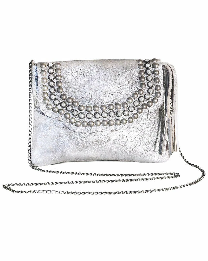 This cute and tonal crossbody bag is studded with glittering crystals, accented with a tasseled zipper pull and delicate chain strap.