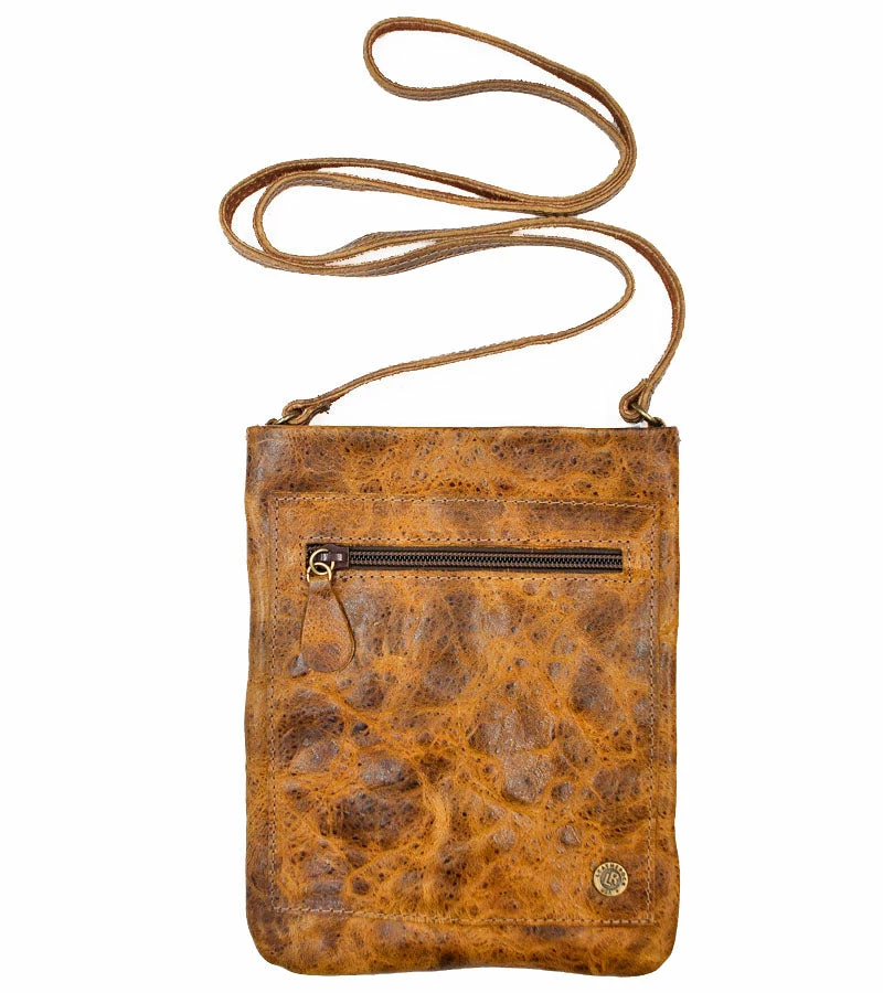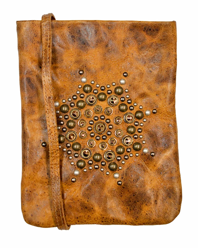 This cell phone pouch is made in a distressed leather. A studded star design adds sparkle and a western flair.