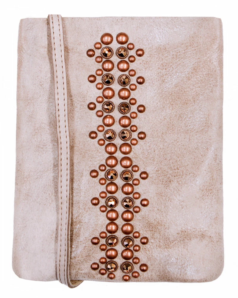An update to our classic cell phone pouch style. A studded crystal design runs down the middle, adding interest to this on-the-go bag.