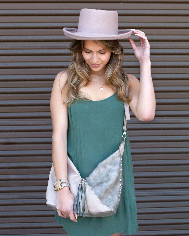 A playful hobo bag with studded details on the side. Double tasseled zippers add a finishing touch.