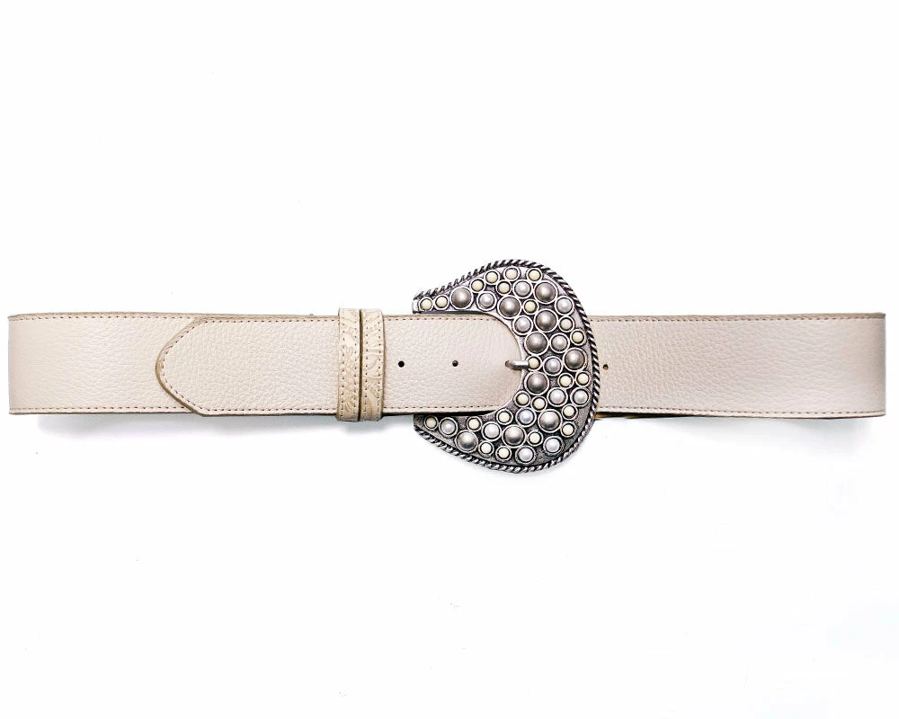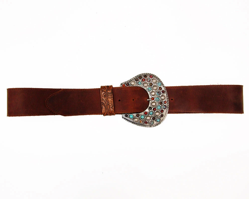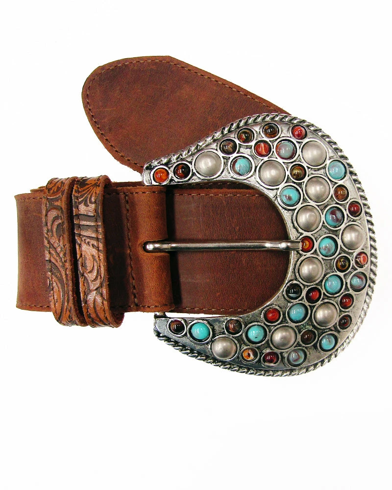 Multi-colored cabochons dot the over-sized buckle of this style, to bring a western flair to any look.Â