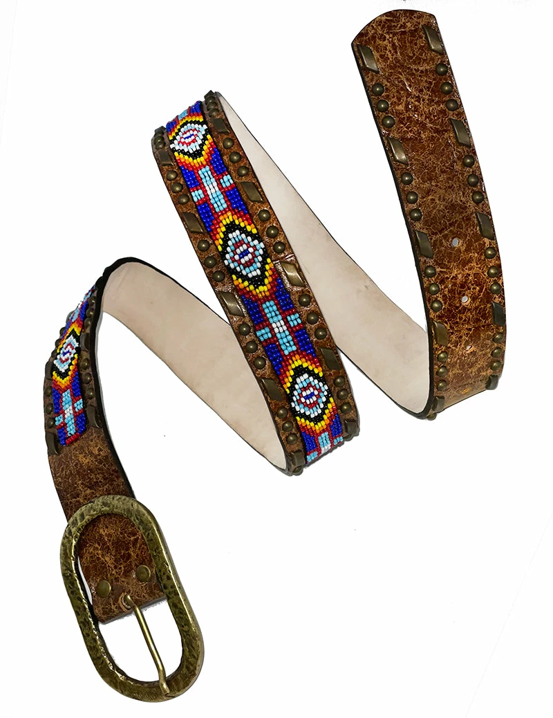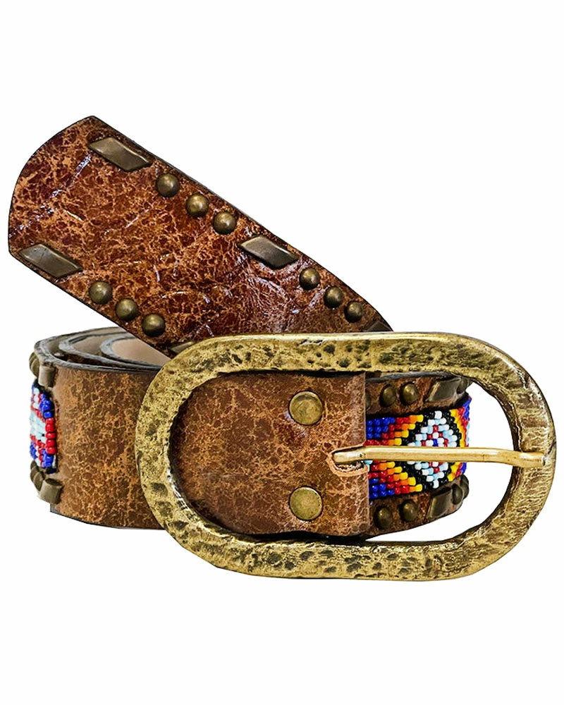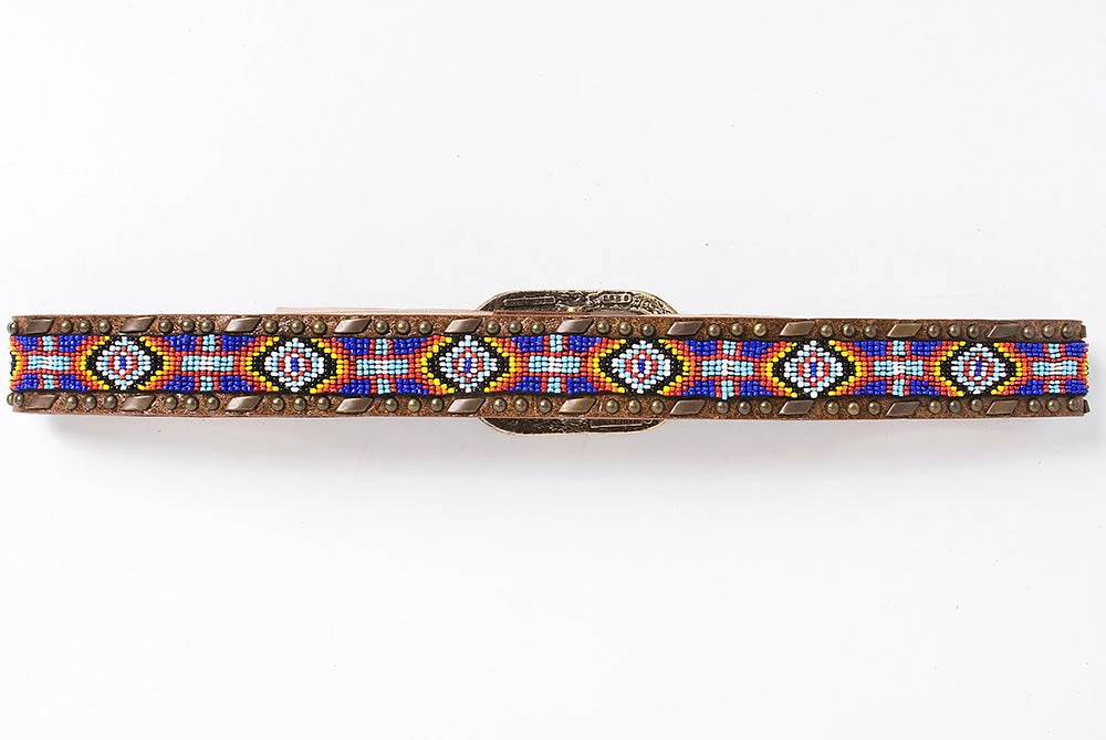 Colorful, beaded trim makes this jean belt special, accented with a hammered oval buckle in a Brass-Copper combination finish.
