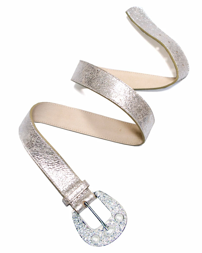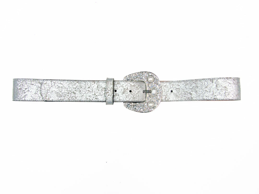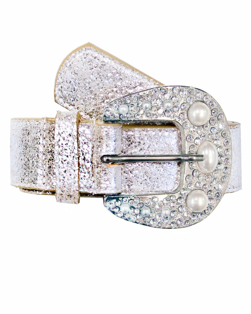 White pearls are nestled in a sea of sparkling crystals on this stunning buckle, accented with a metallic leather strap.Â