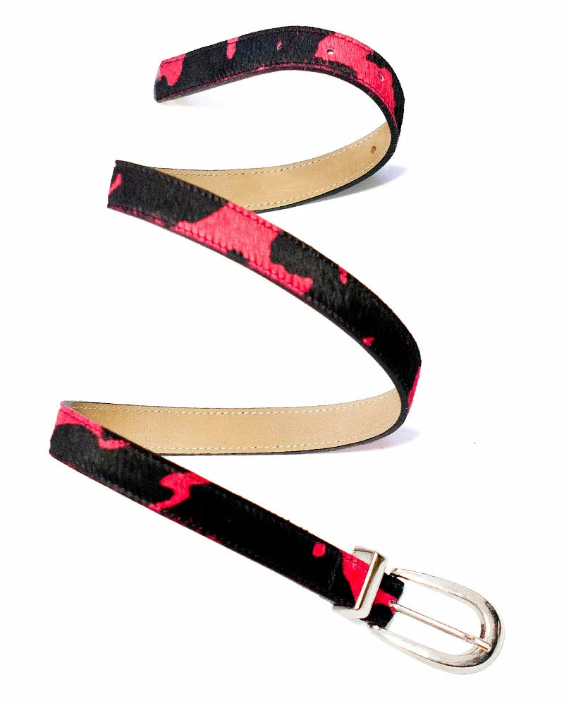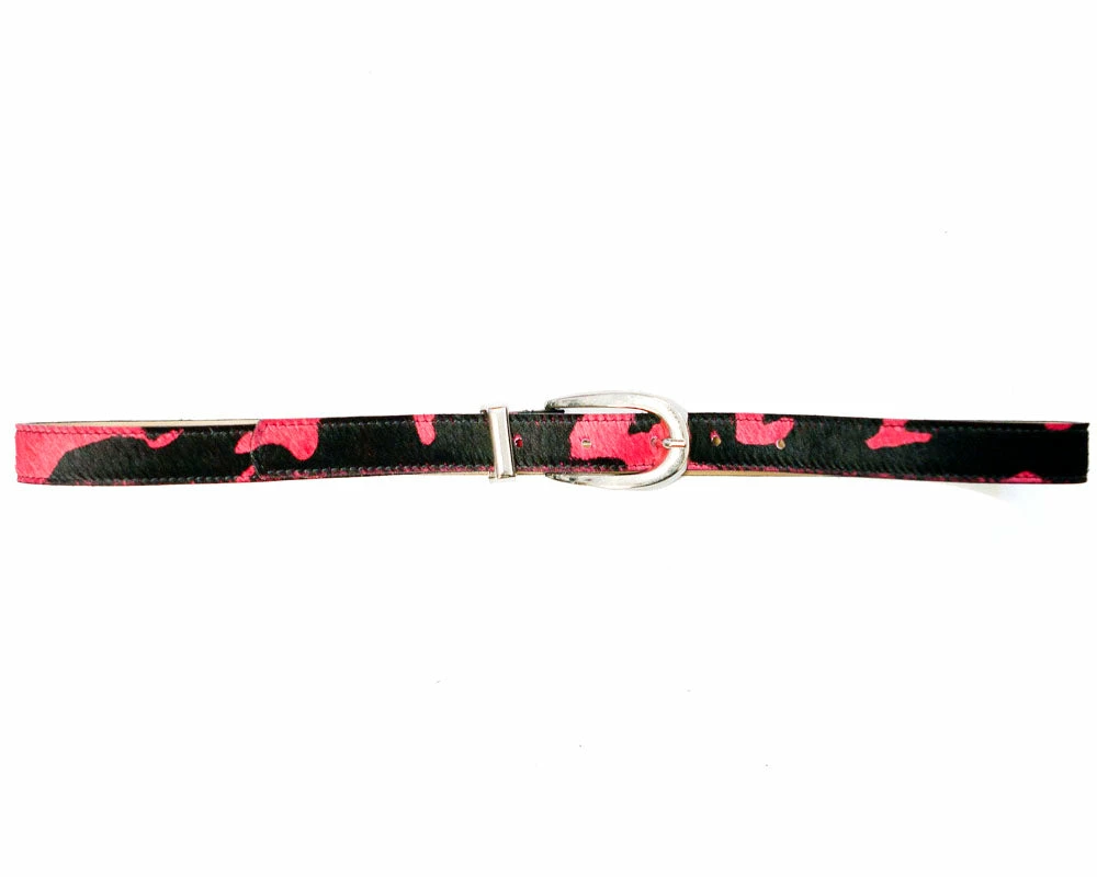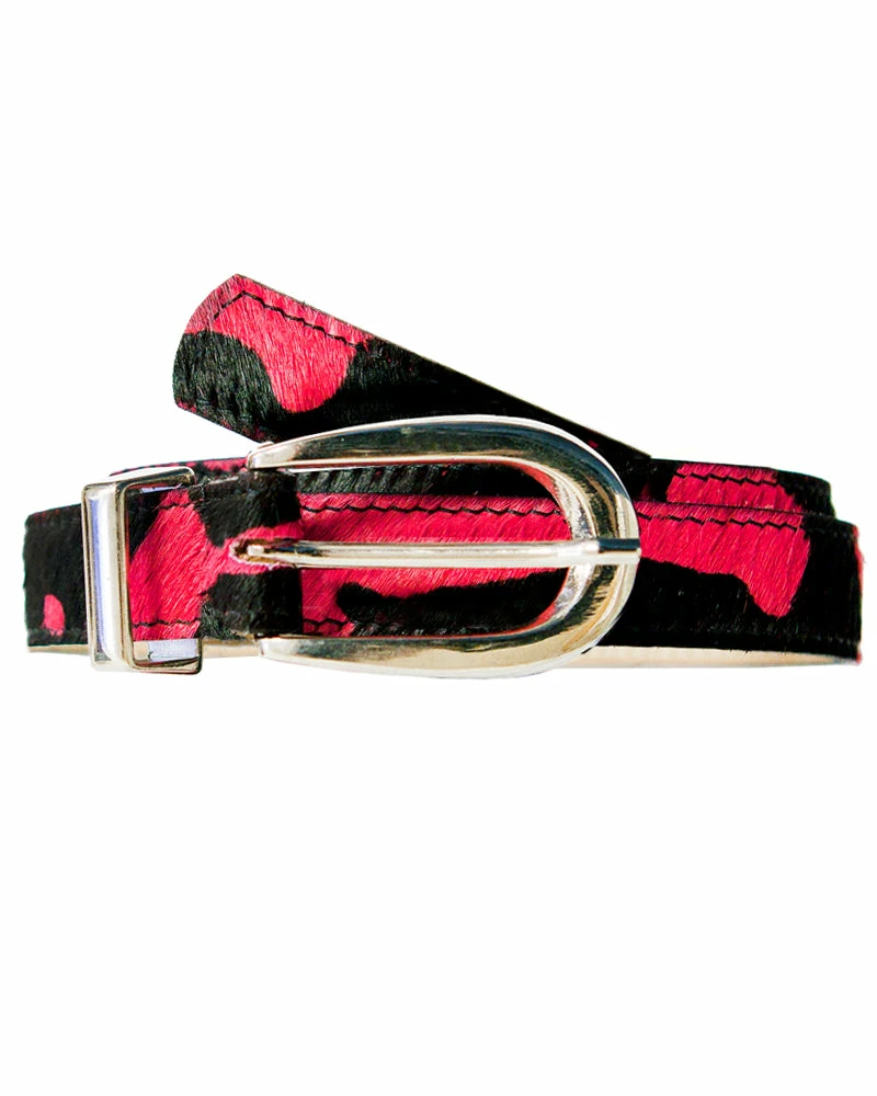 Bright fuchsia and black cow print bring a fun element to this skinny belt.Â