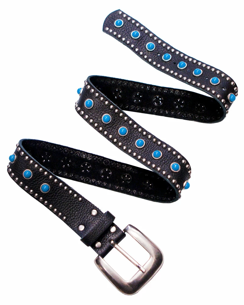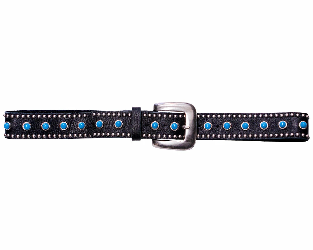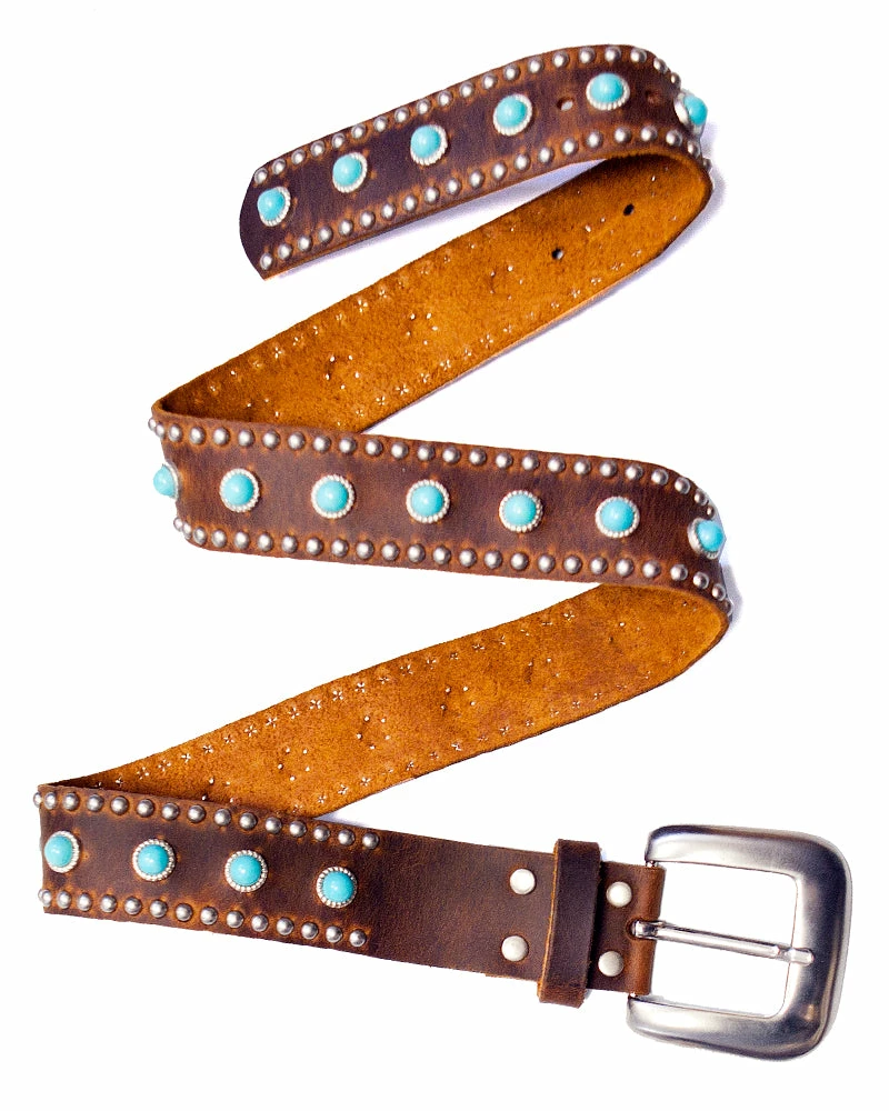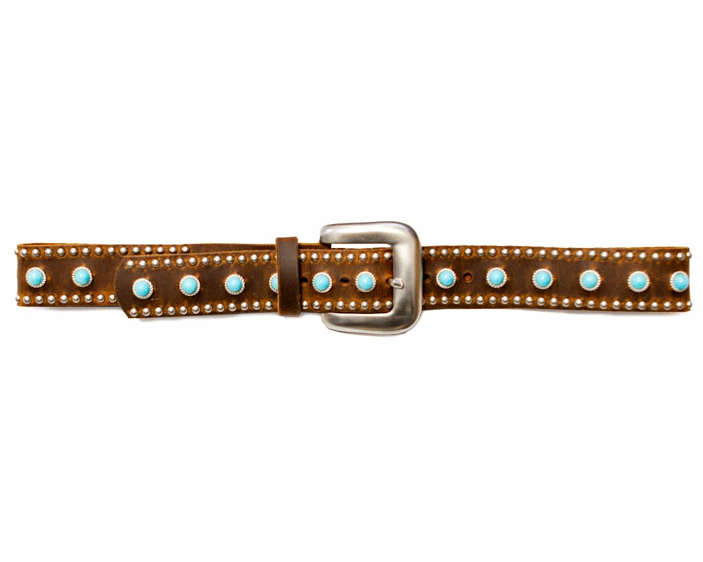 A classic western combination of turquoise and tobacco make up this studded belt, finished with a simple satin buckle.Â