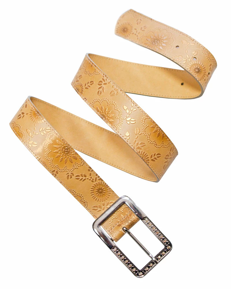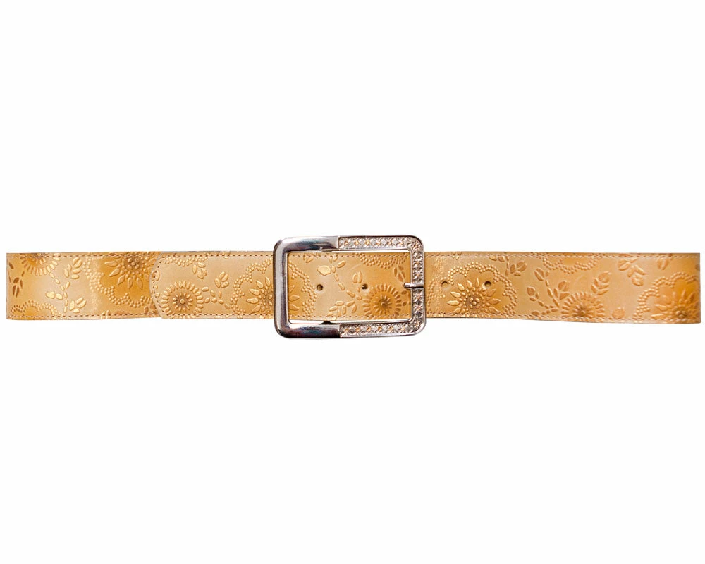 A classic belt with a twist, made in an embossed leather with a matte-metallic flower pattern. The polished buckle is inlaid with tiny crystals for an extra sparkle.Â
