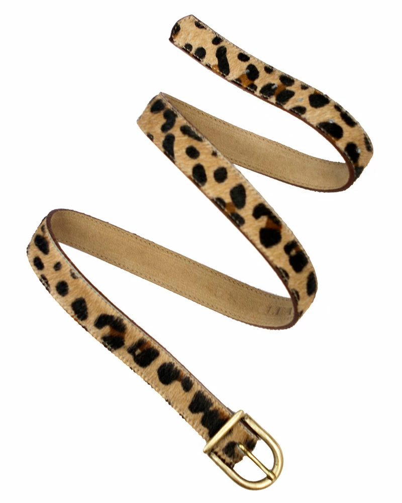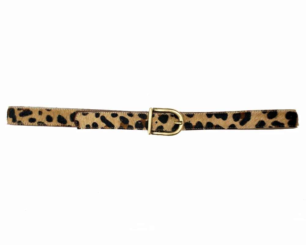 A skinny belt made in patterned leather. Finished with a rounded buckle.Â