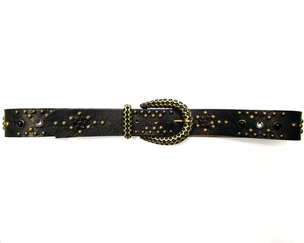 Brass hardware contrasts black leather on this jean belt with crystal encrusted buckle.Â
