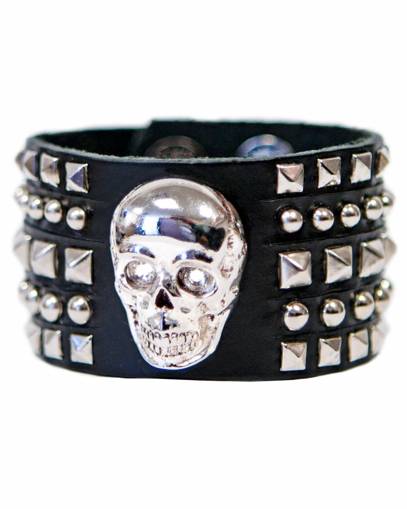 Bring a little rebellion to your style by rocking this grinning skull cuff, with twinkling crystal eyes and shiny silver studs.Â