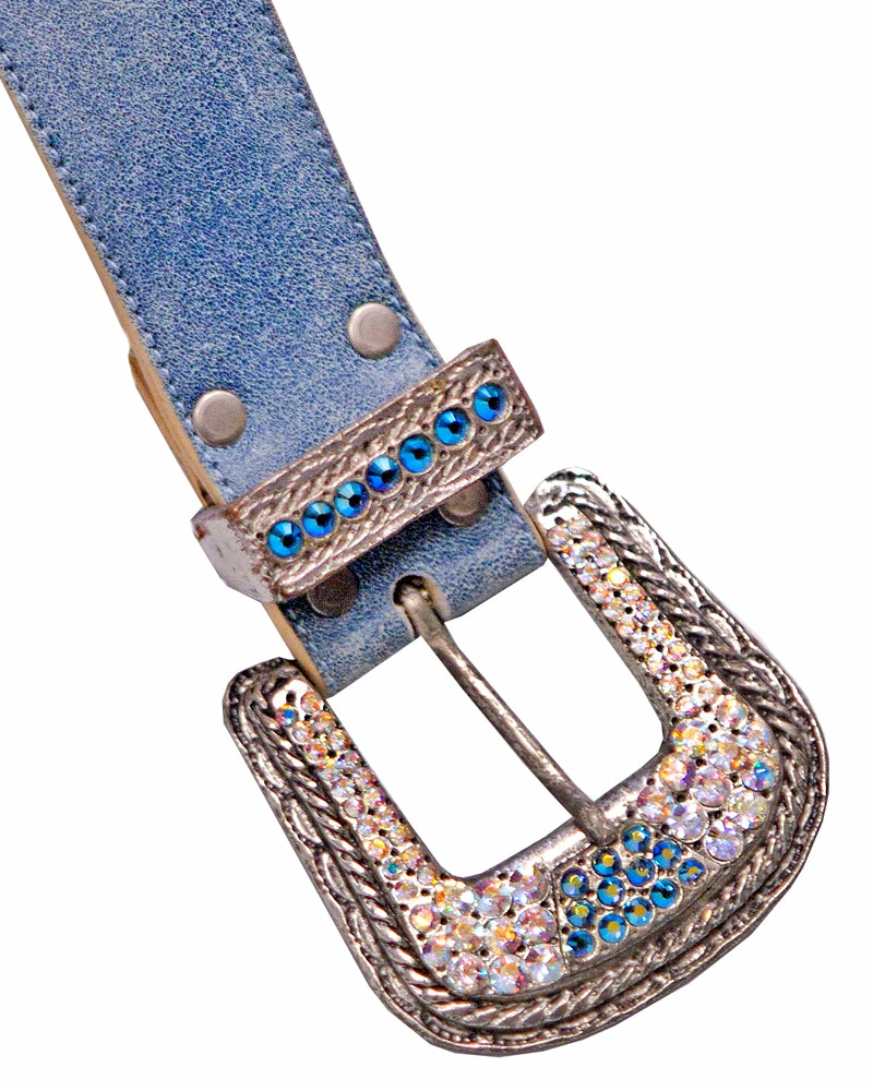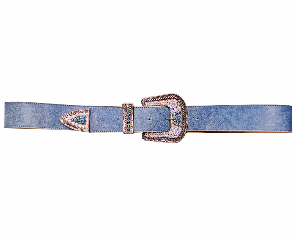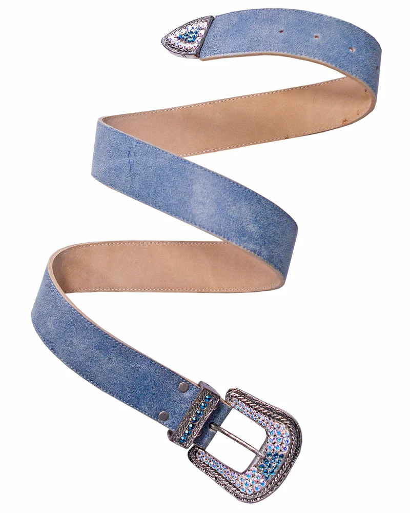 Distressed leather gives the look of denim, finished with a crystal-covered buckle!