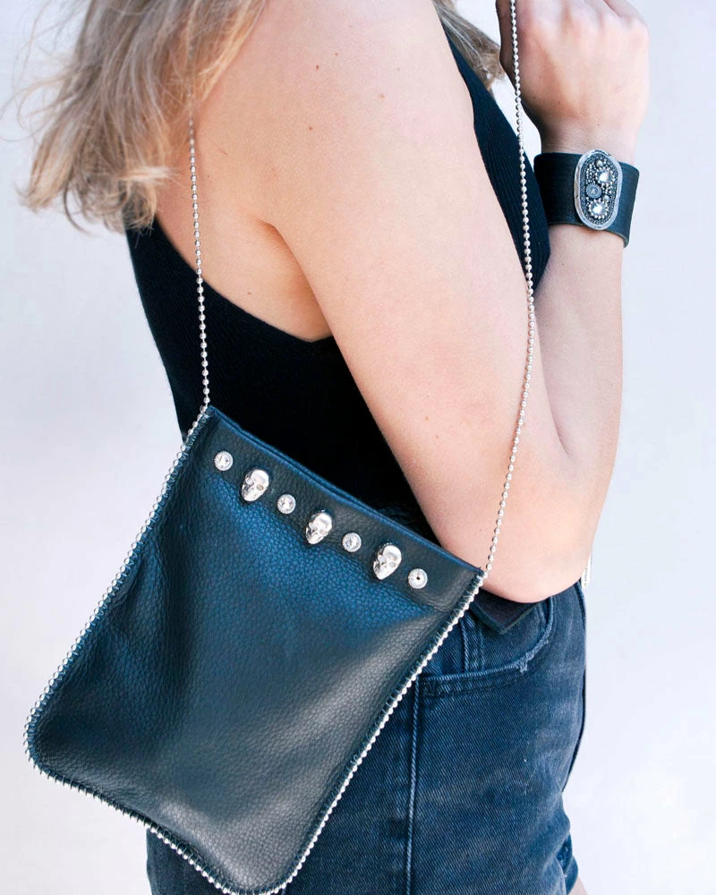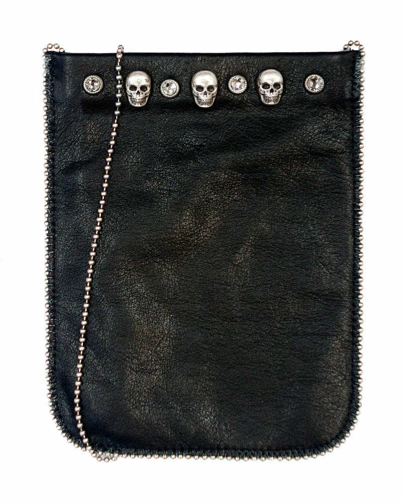 Small skulls grin from the top of this perfectly-sized crossbody pouch, accented with glittering crystals.Â