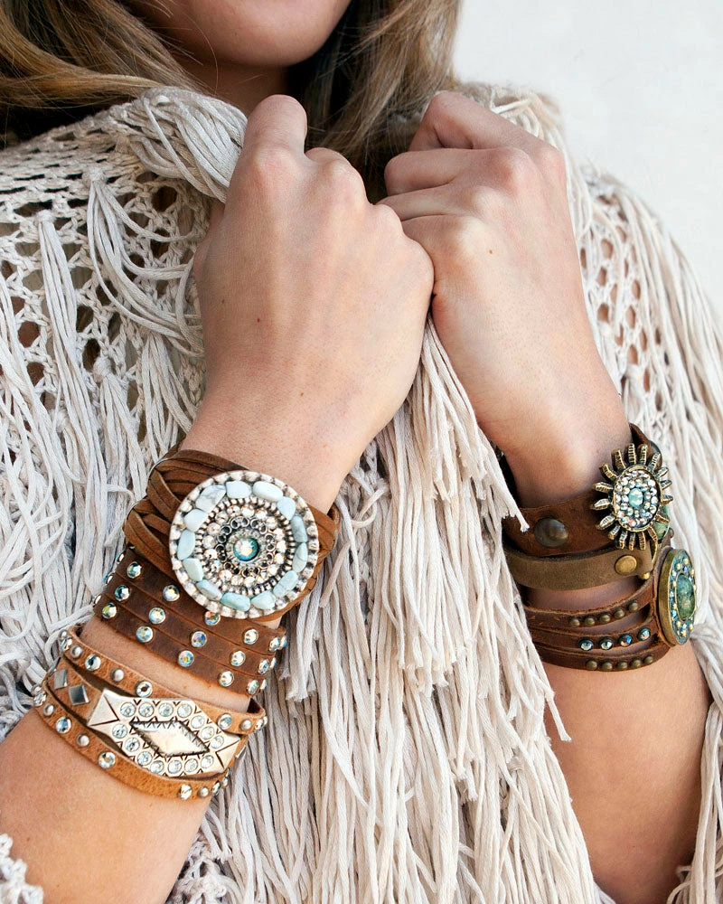 This gorgeous cuff will catch eyes with sparkling chips and crystals set into a round centerpiece.