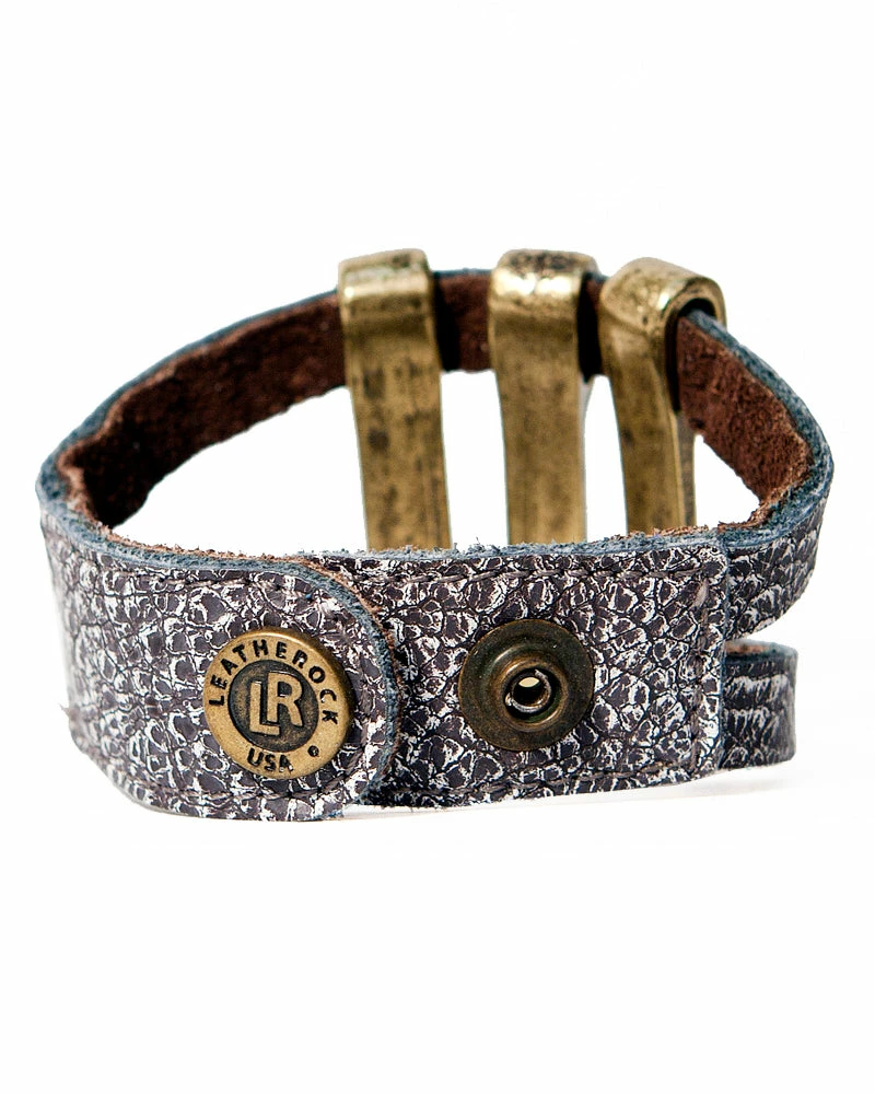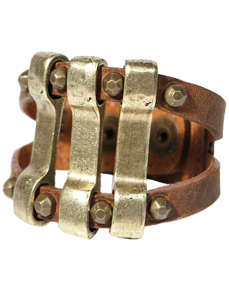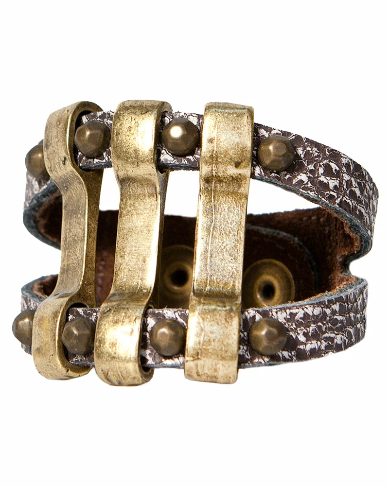 Distressed metal bars are separated by english-cut studs on this leather cuff.Â