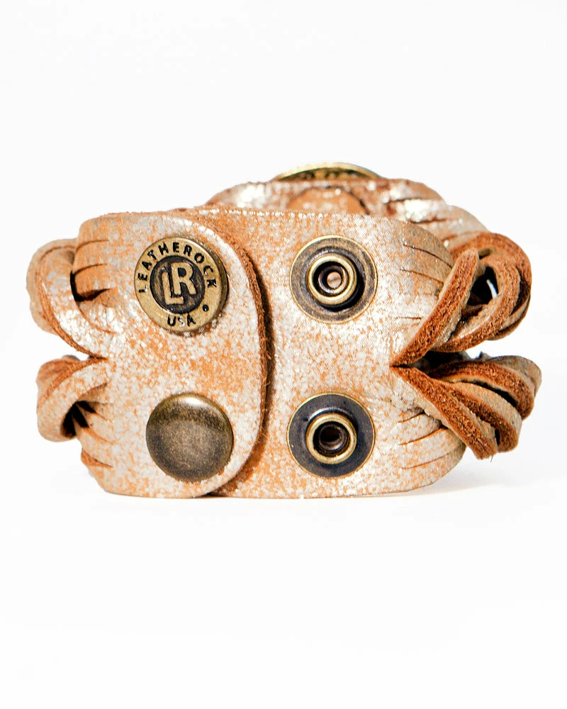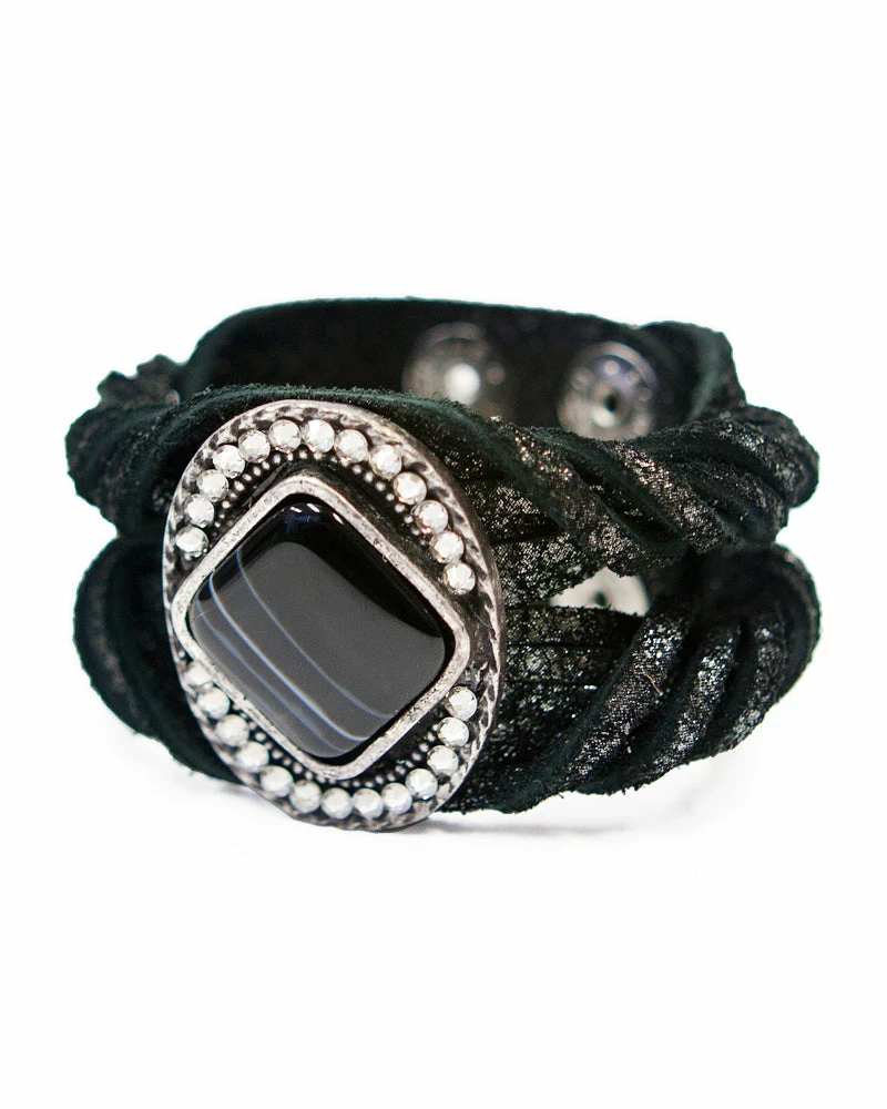 Twisted metallic leather forms the band of this bracelet, while a semi-precious stone and sparkling crystals sit in the center.Â