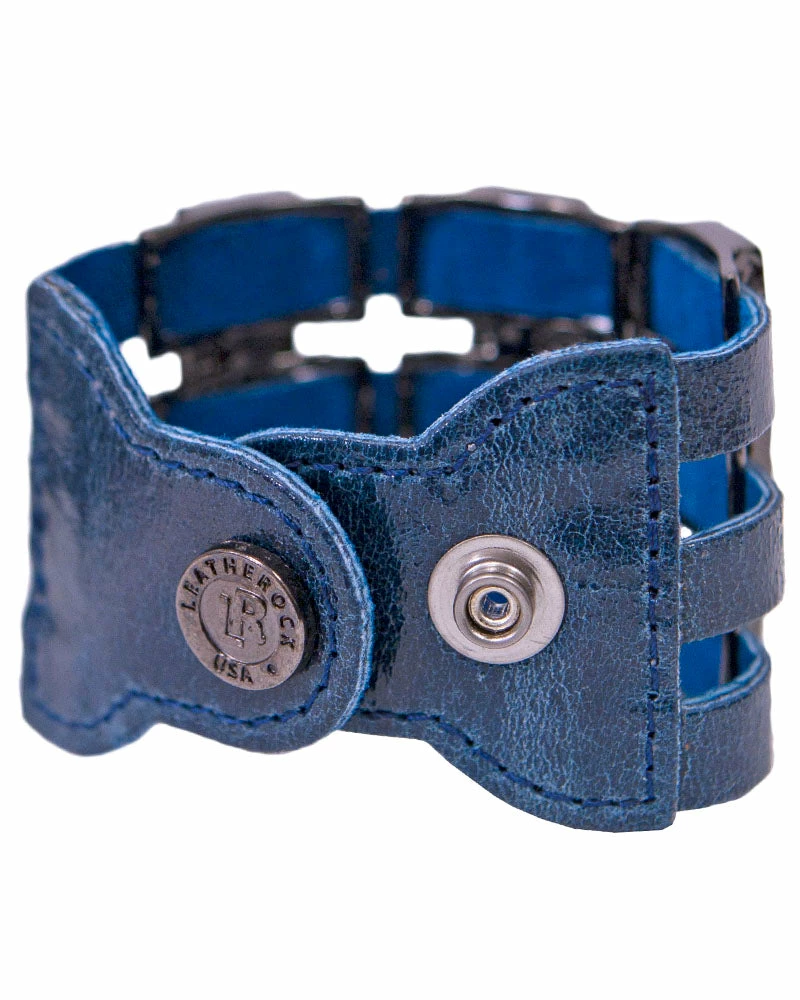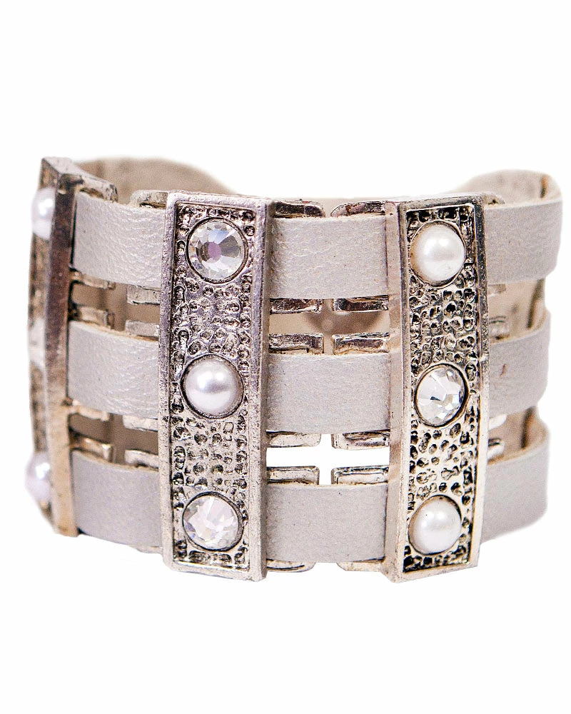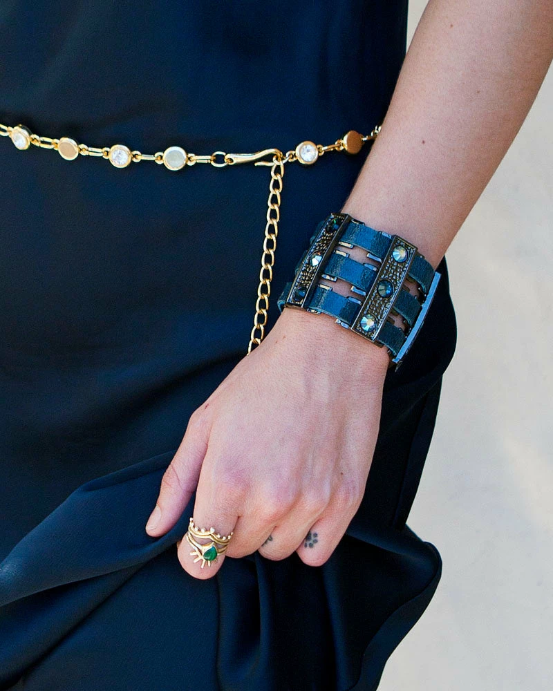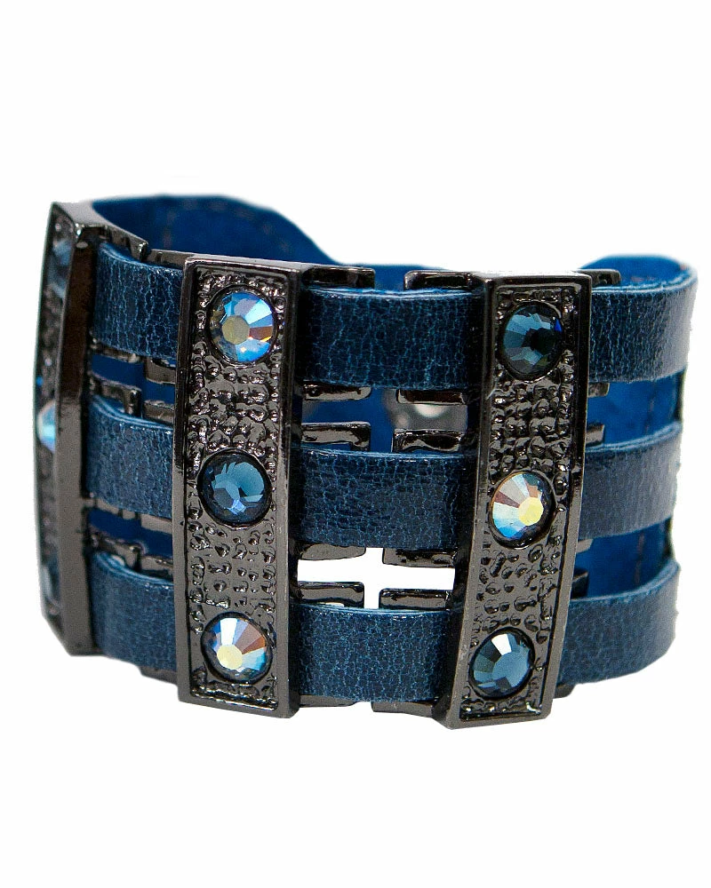 Sparkling crystals are set into antiqued sliders on leather strands.