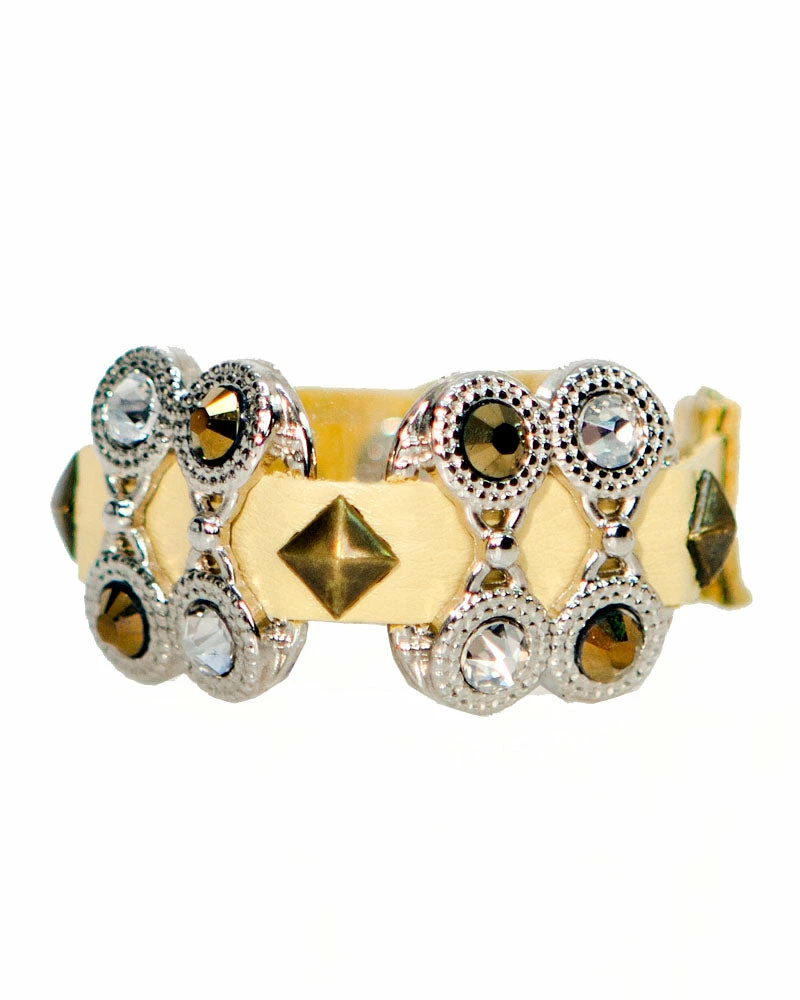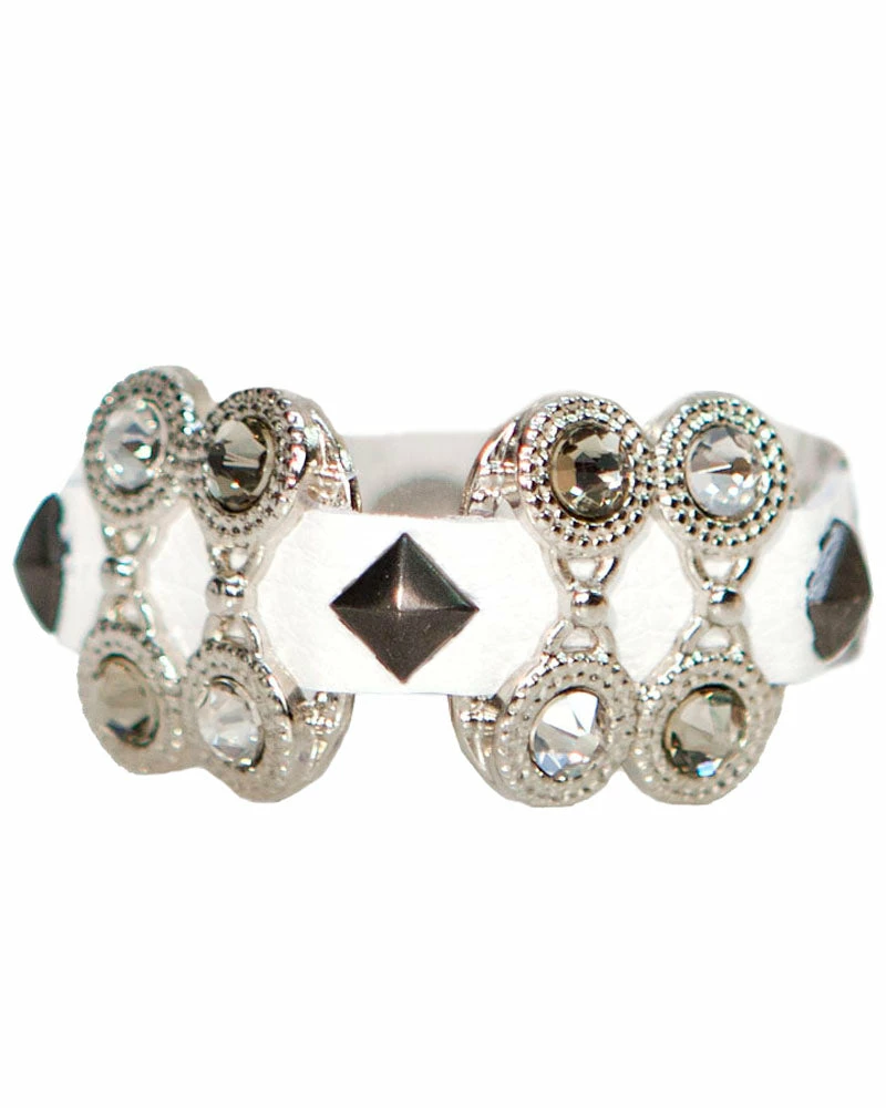 Mixed hardware and crystals sit on a soft leather band. This bracelet adds sophisticated sparkle to any outfit!
