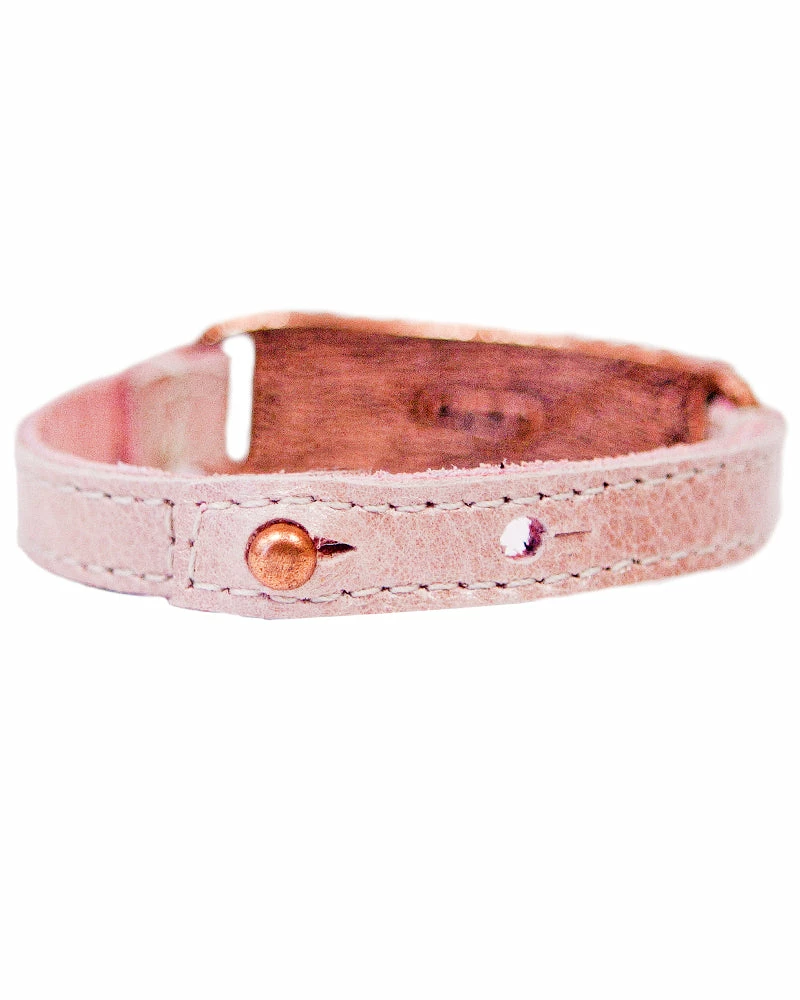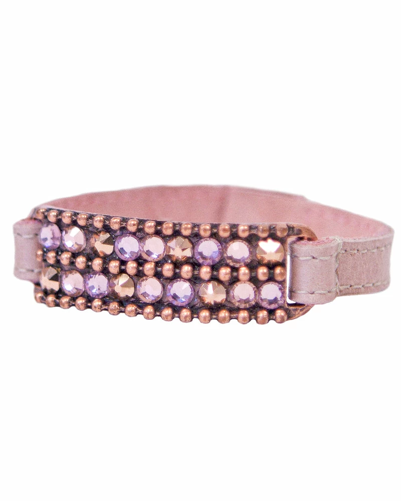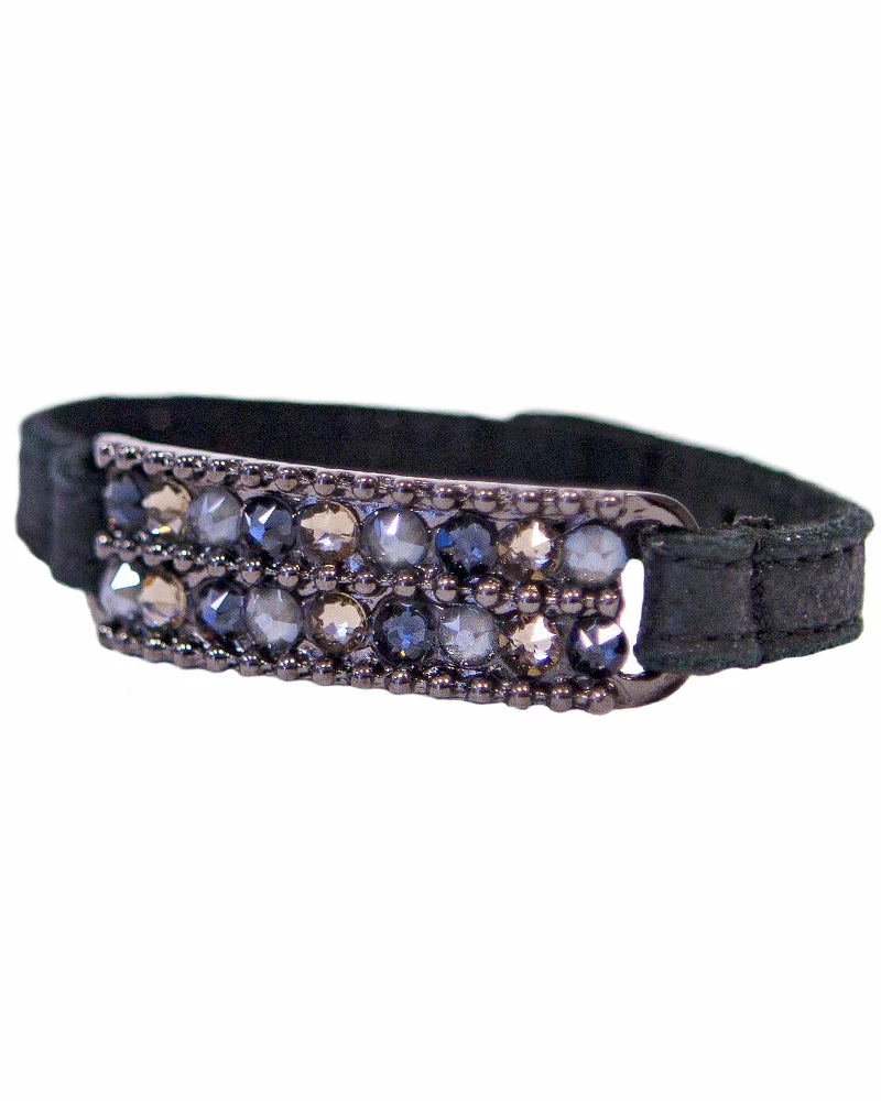 Small, multi-colored crystals shine from their setting on a skinny leather strap.Â