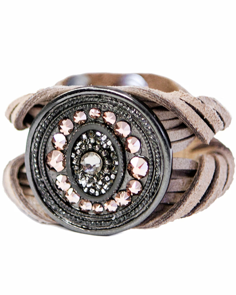 Glittering crystals are set in a detailed ornament, on a twisted leather band that adds contemporary style to this cuff.