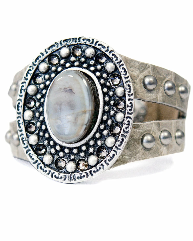 The statement of this bracelet is the center ornament, encrusted with a beautiful stone and crystals.Â