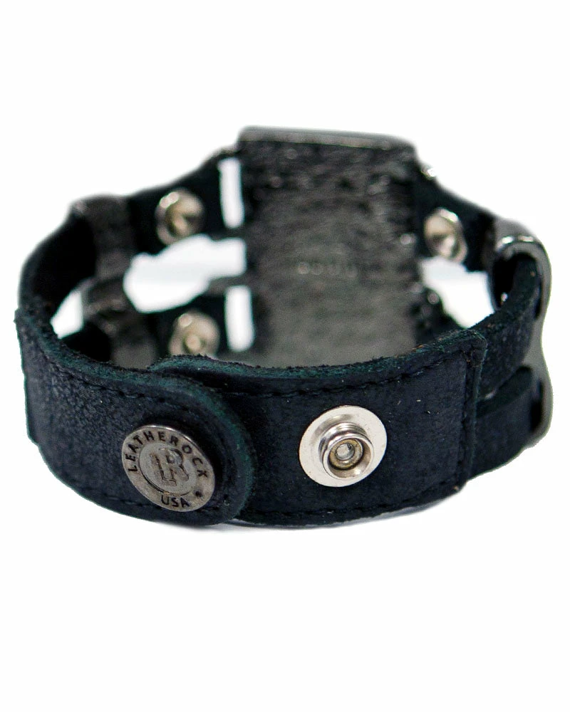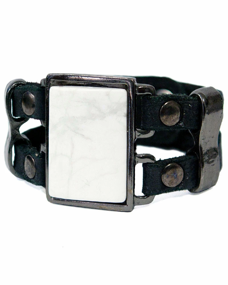 A large semi-precious stone stands out on dark hardware and a dark leather band.