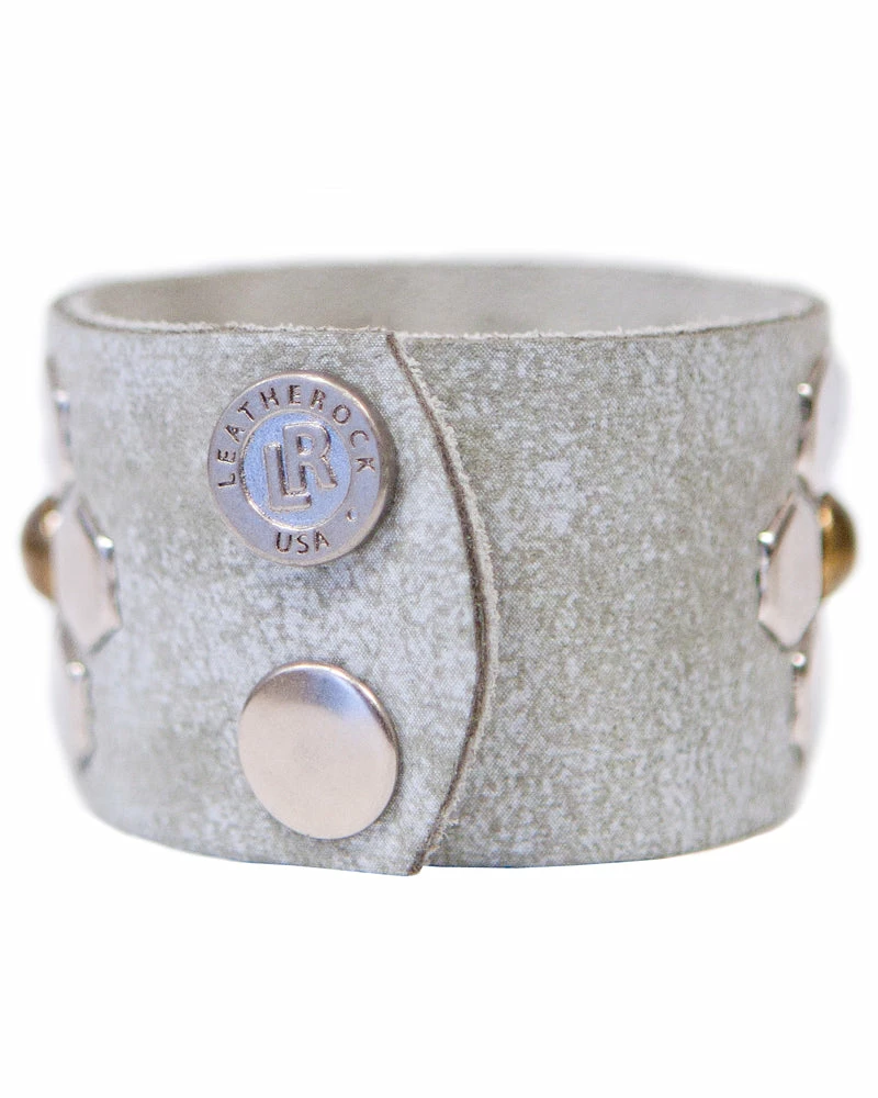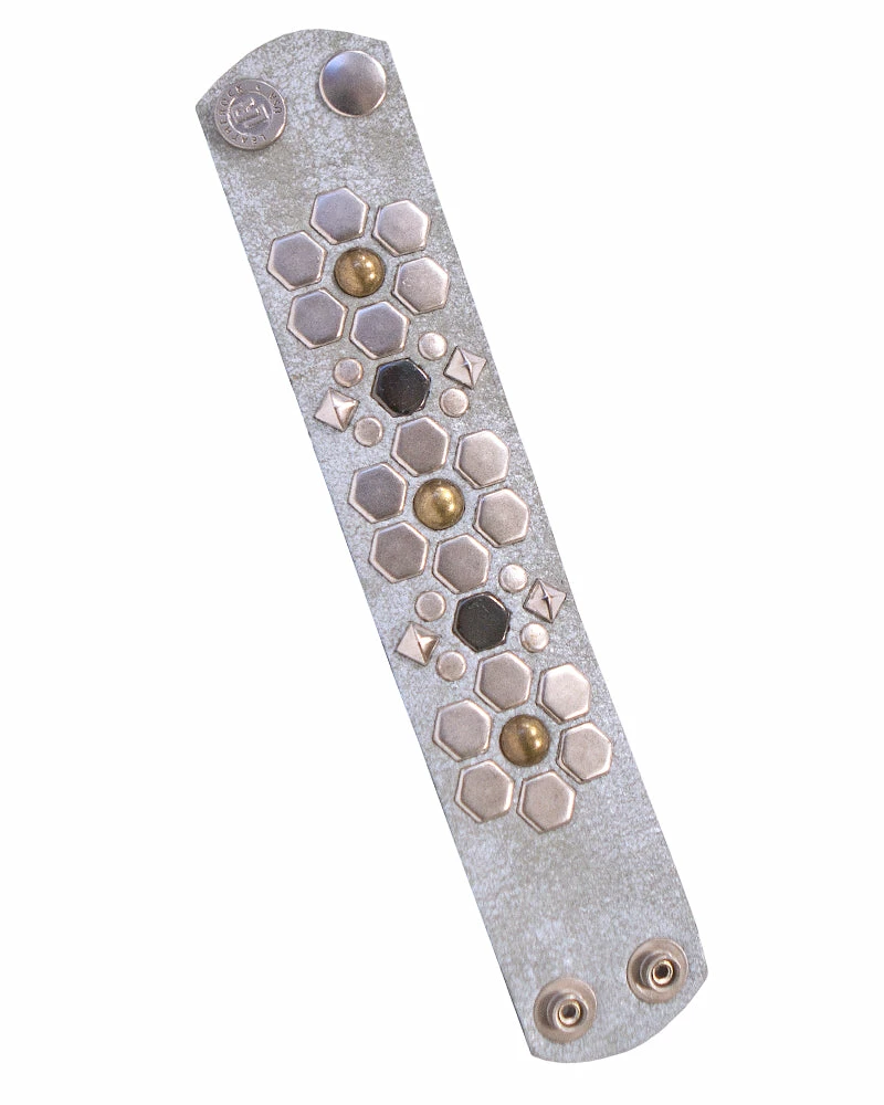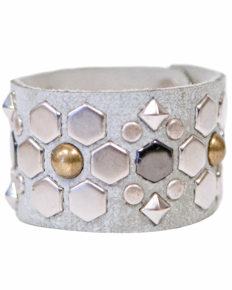 Different studs shapes form subtle flowers to give a feminine touch to this light leather cuff.