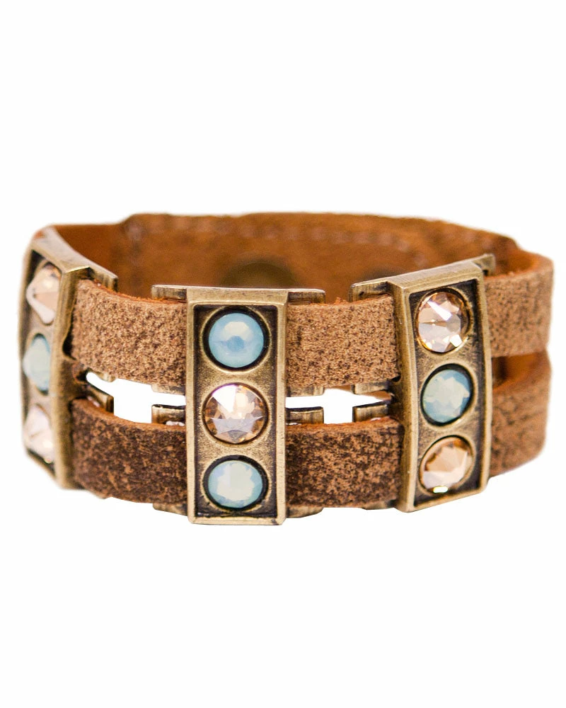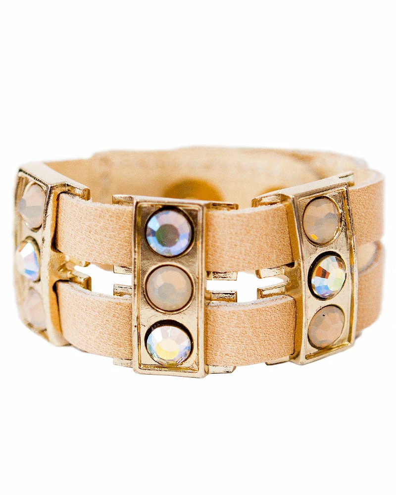 This simple yet stunning bracelet shows off sparkling crystals set in hardware on a leather band.