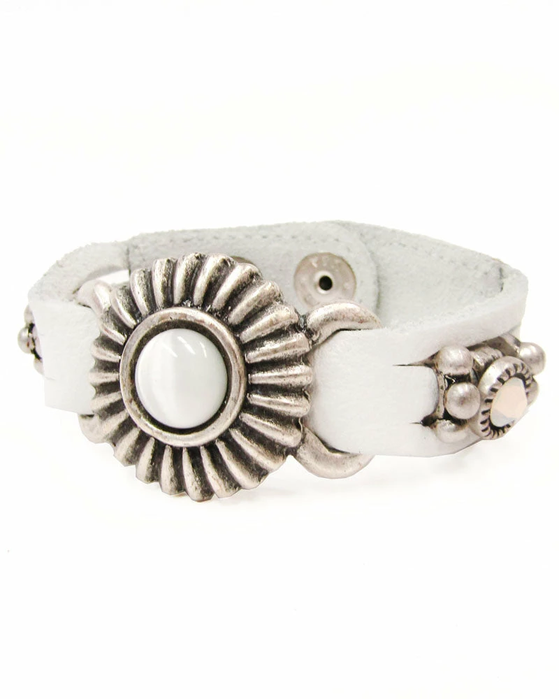 A floral-inspired hardware takes center stage on this multi-strand bracelet, completed with monochrome stones and crystals.Â