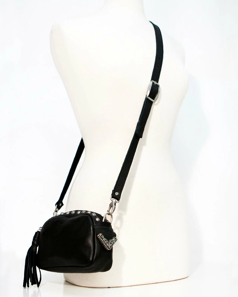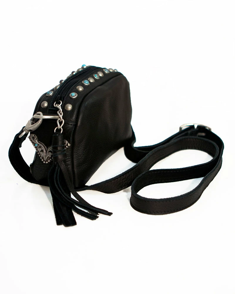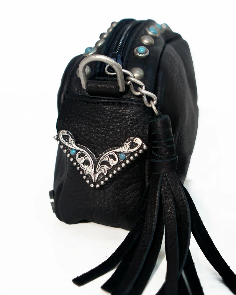 This camera bag style is transformed with western hardware details and pops of turquoise color.