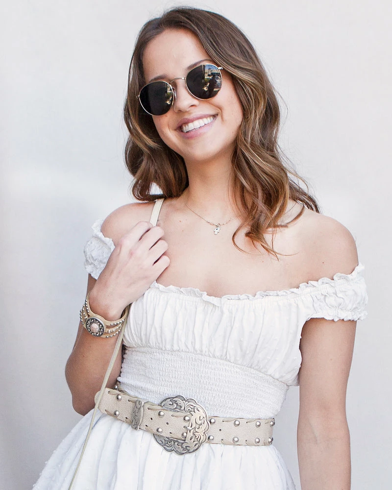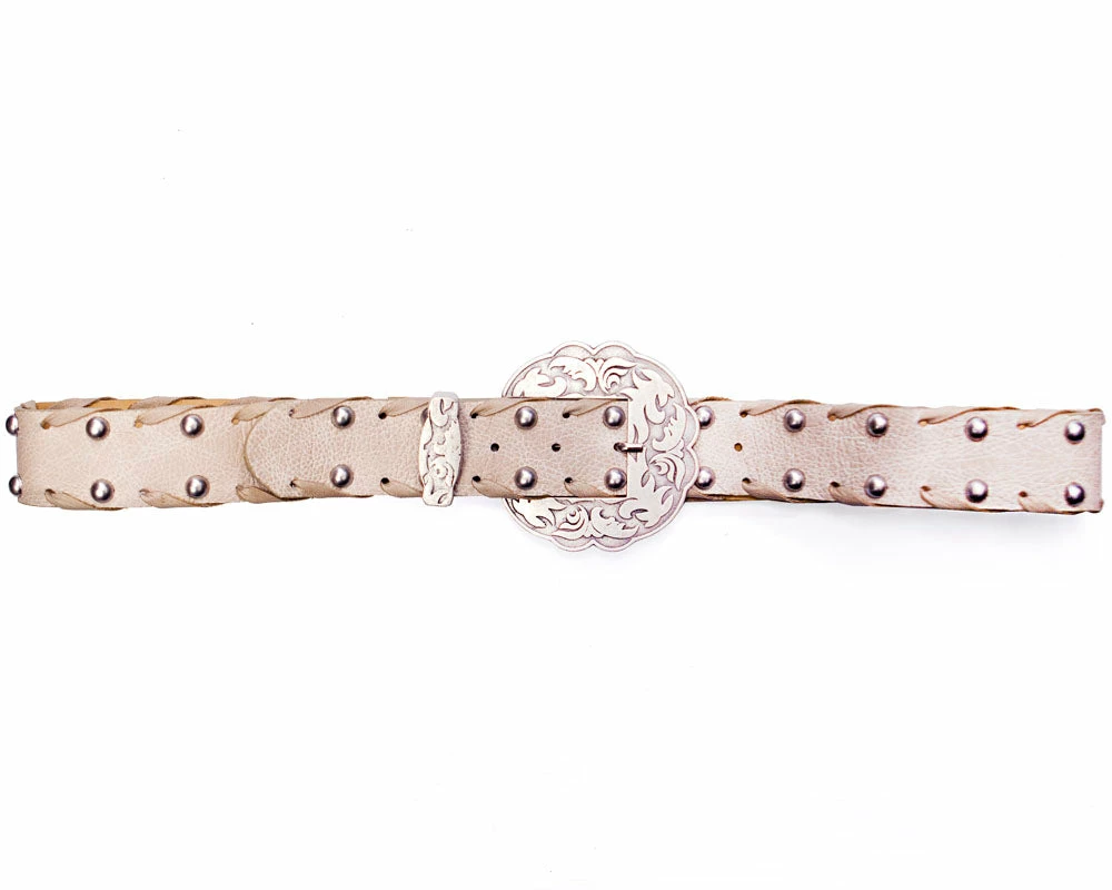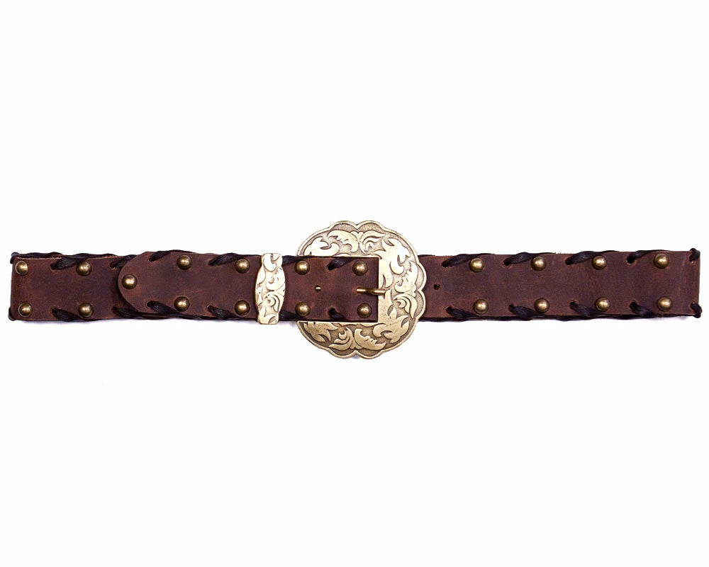 A studded leather strap is frame by a floral buckle with matching keeper.
