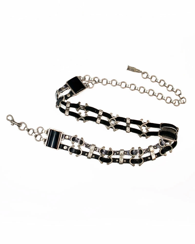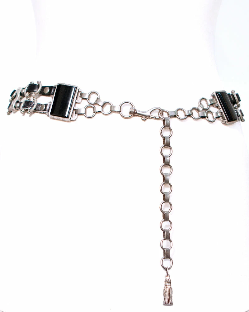 Black semi-precious stones are strung onto textured leather and accented with hammered hardware to form this chain belt.