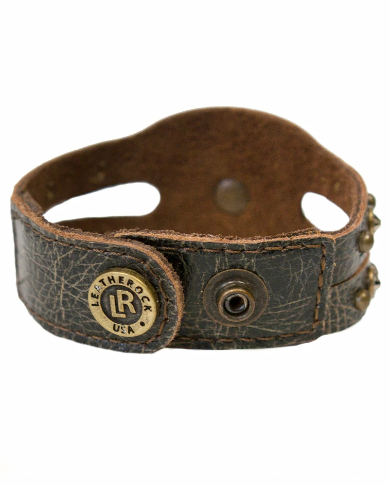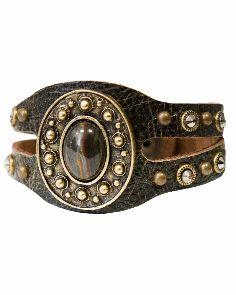 Studded leather strips draw the eye towards a semi-precious centerpiece.Â