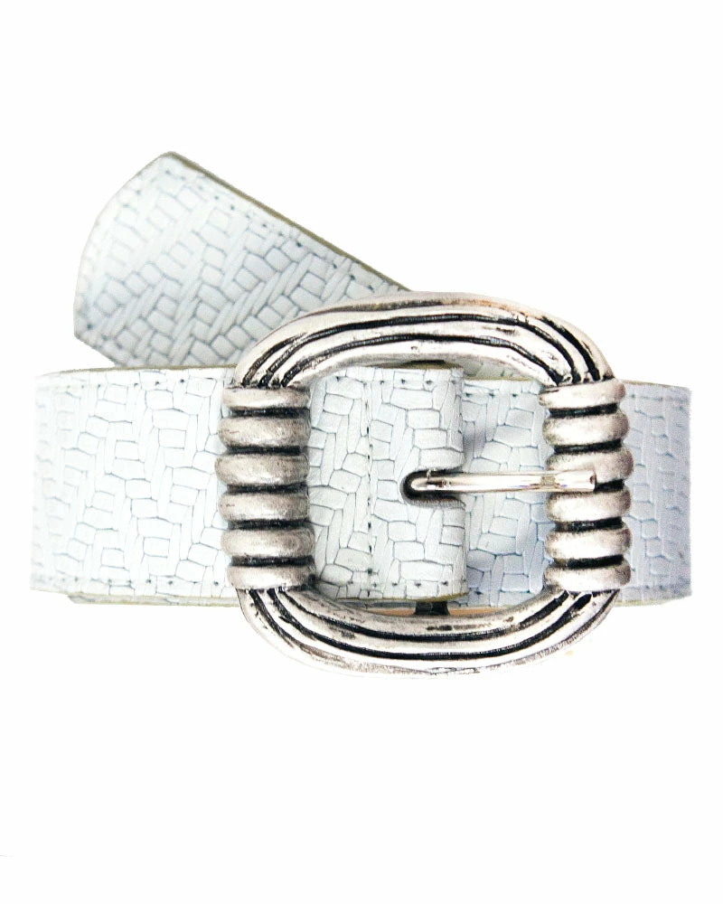 A rattlesnake inspired buckle brings an edge to this printed-leather belt.