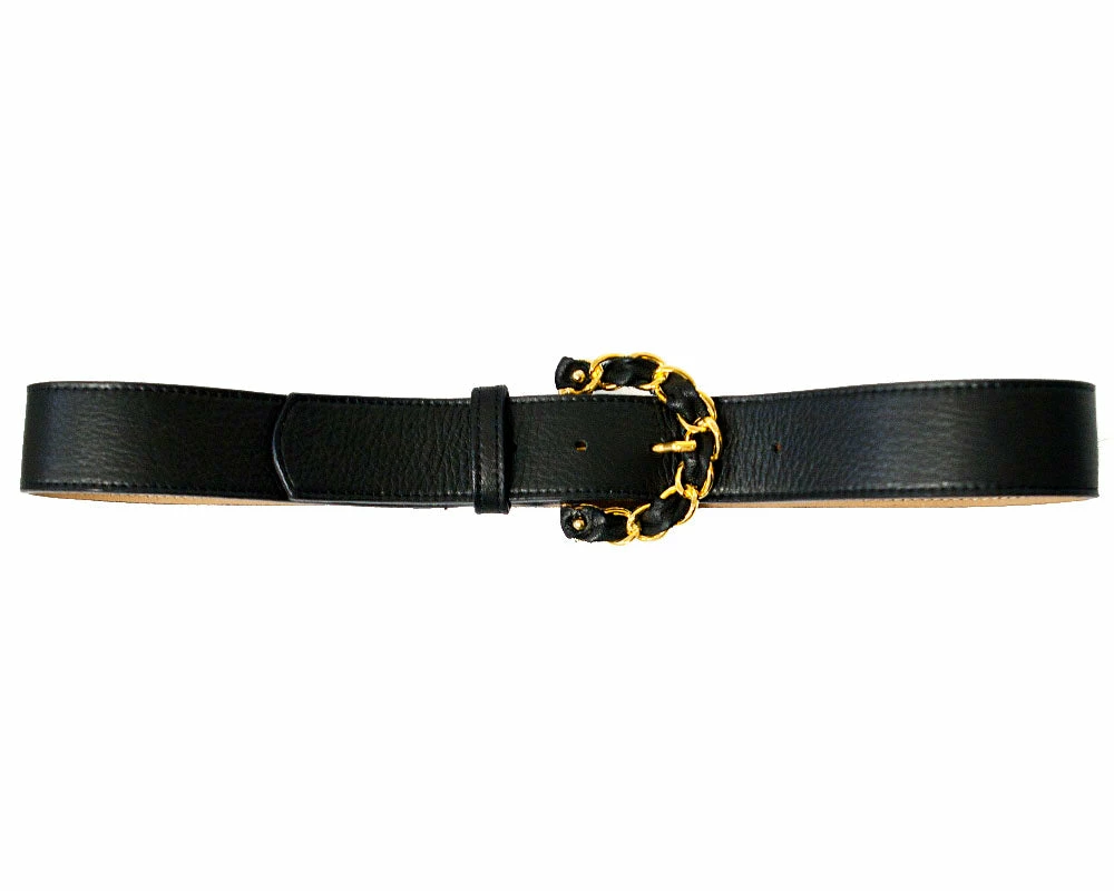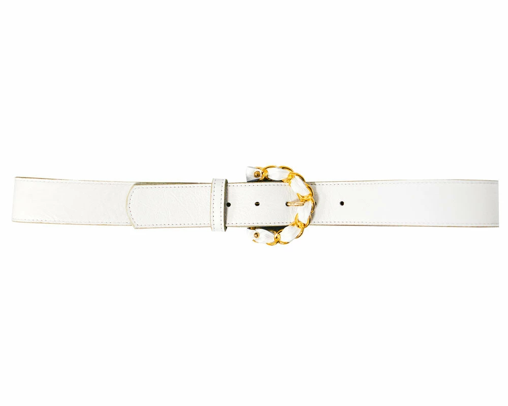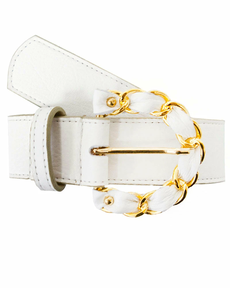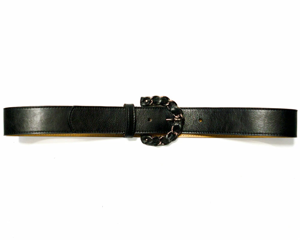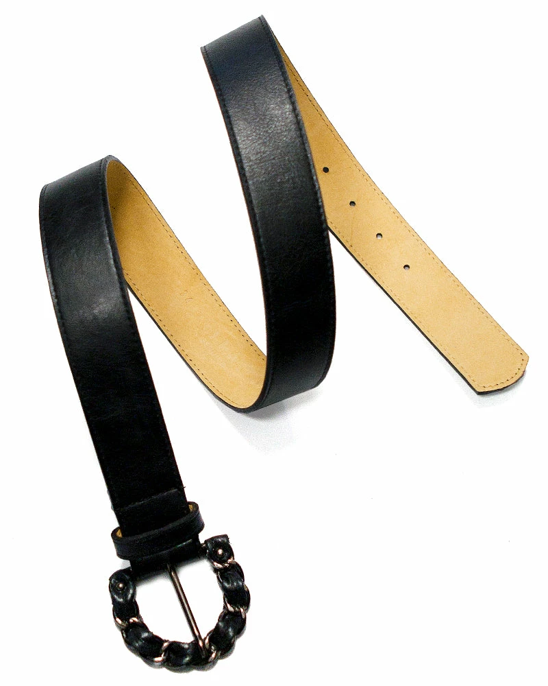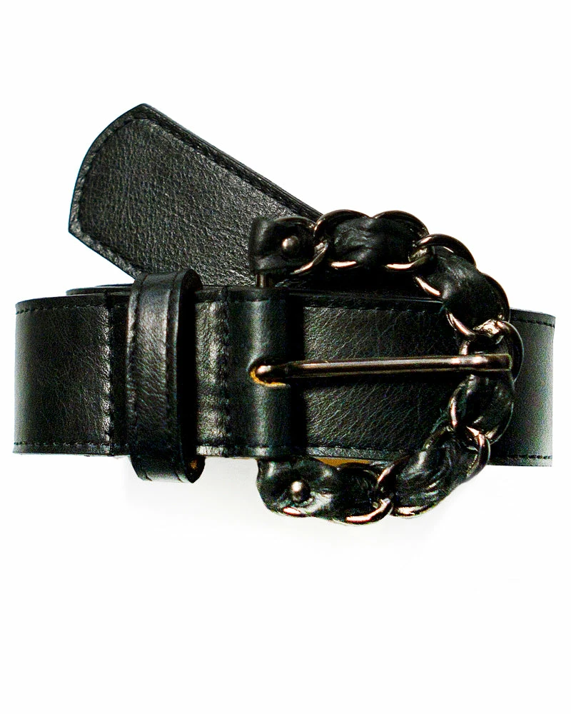 Leather is laced through a polished chain buckle on this smooth jean belt.Â