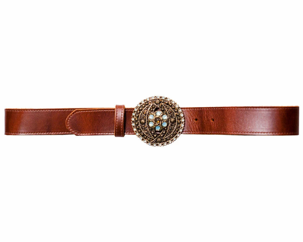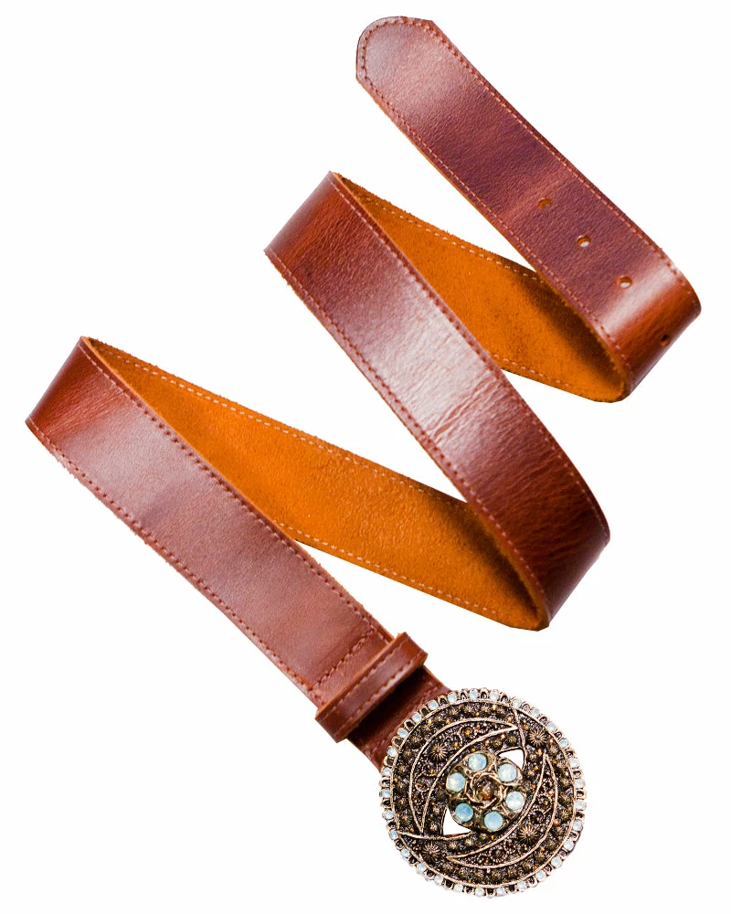 Intricate details on this embellished buckle compliment soft leather to lend refined taste to this belt.Â
