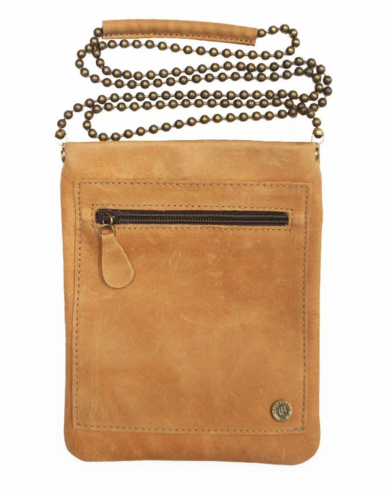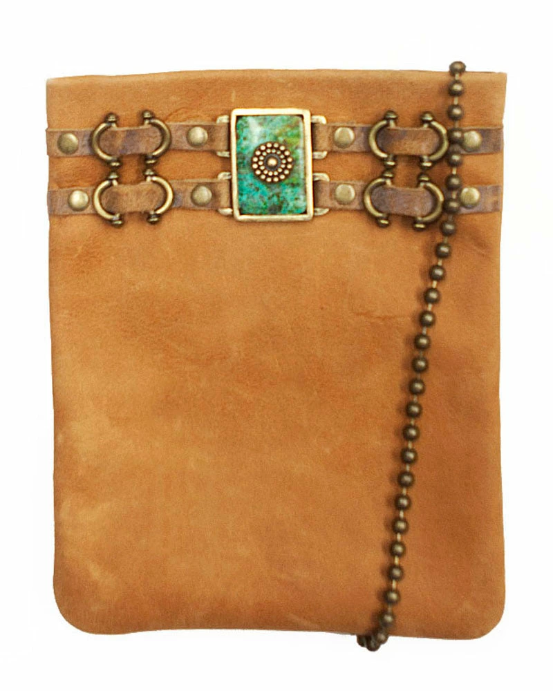 This small but versatile cell phone pouch is accented with a beautiful stone and antiqued hardware details. A zippered pocket on the back adds storage room.