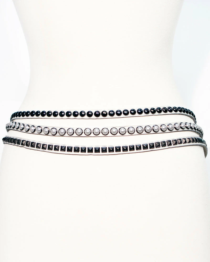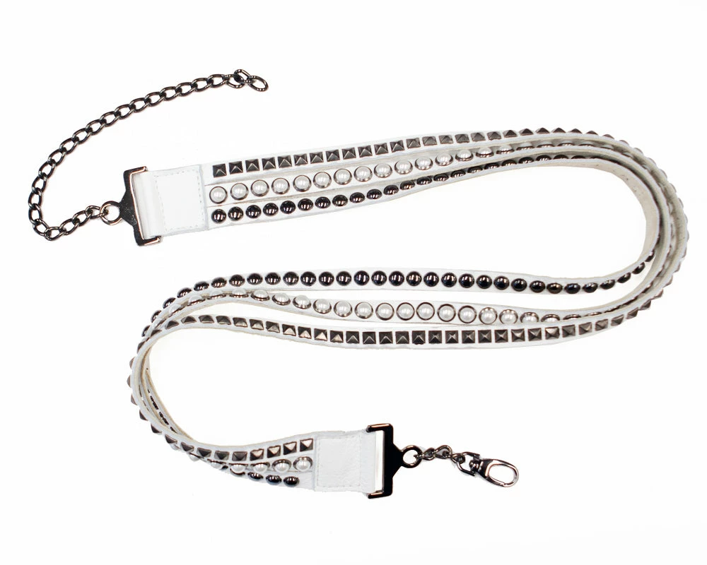 Hematite studs and pearls contrast with white leather on this multi-strand chain belt.Â