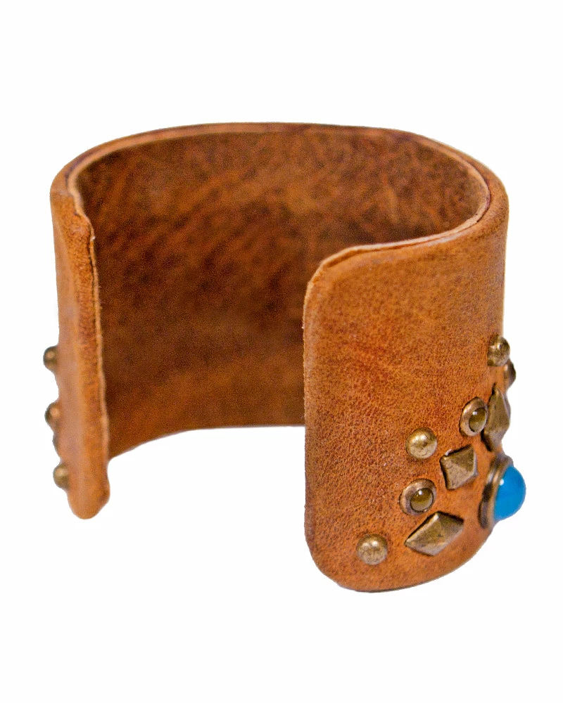 This hard cuff is covered in a rugged leather and finished with a studded design.Â