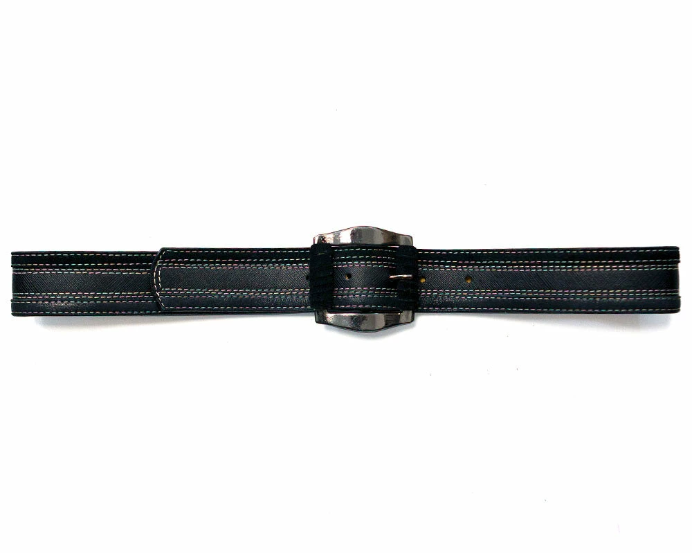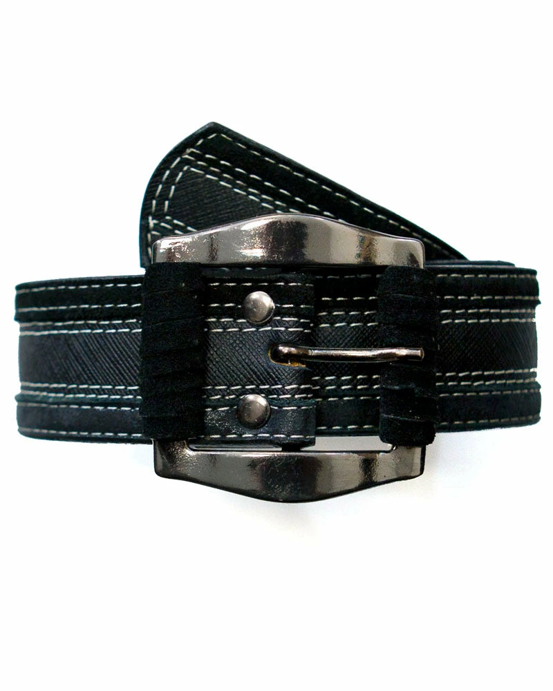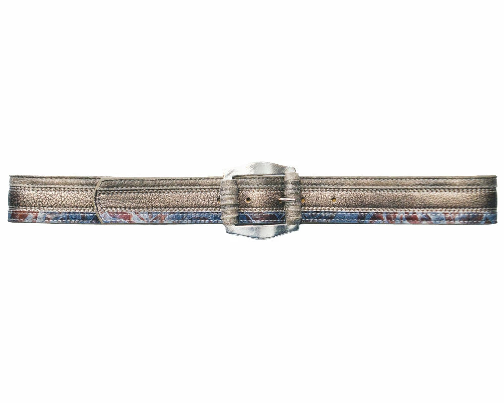 Mixed leathers with contrasting stitching form the strap of this belt, finished with a leather-wrapped buckle.