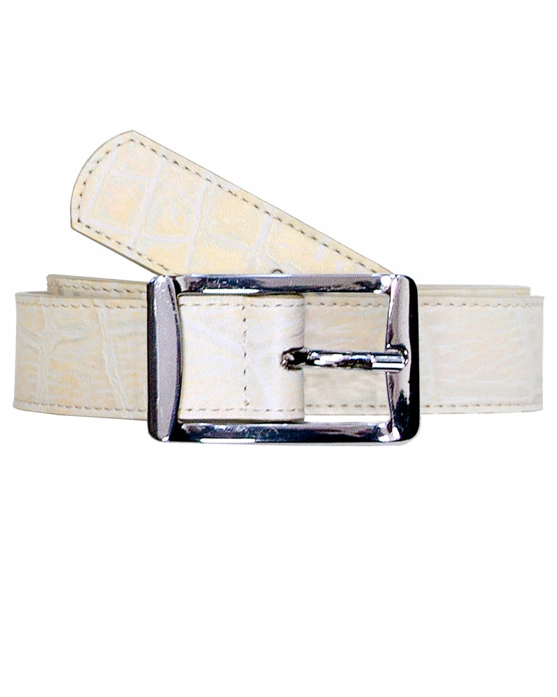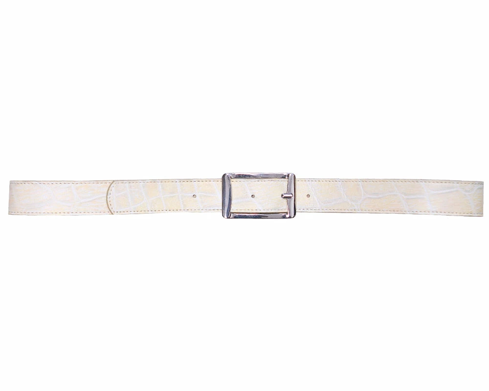 This belt is made with a minty green and yellow embossed leather. A square polished buckle completes the look.Â