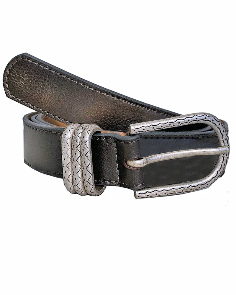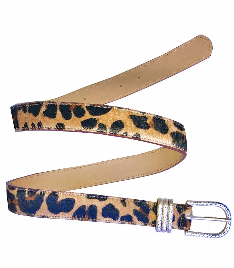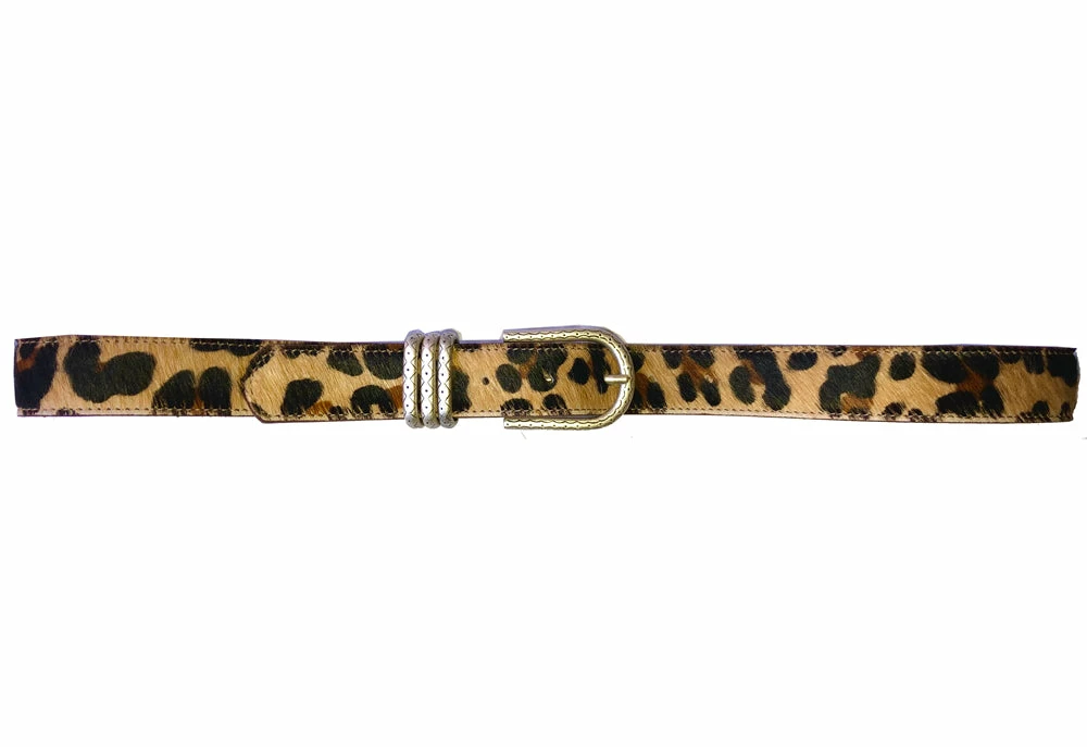 Etched hardware and multiple loops bring a boho touch to this skinny belt in printed calf-hair or metallic leather.