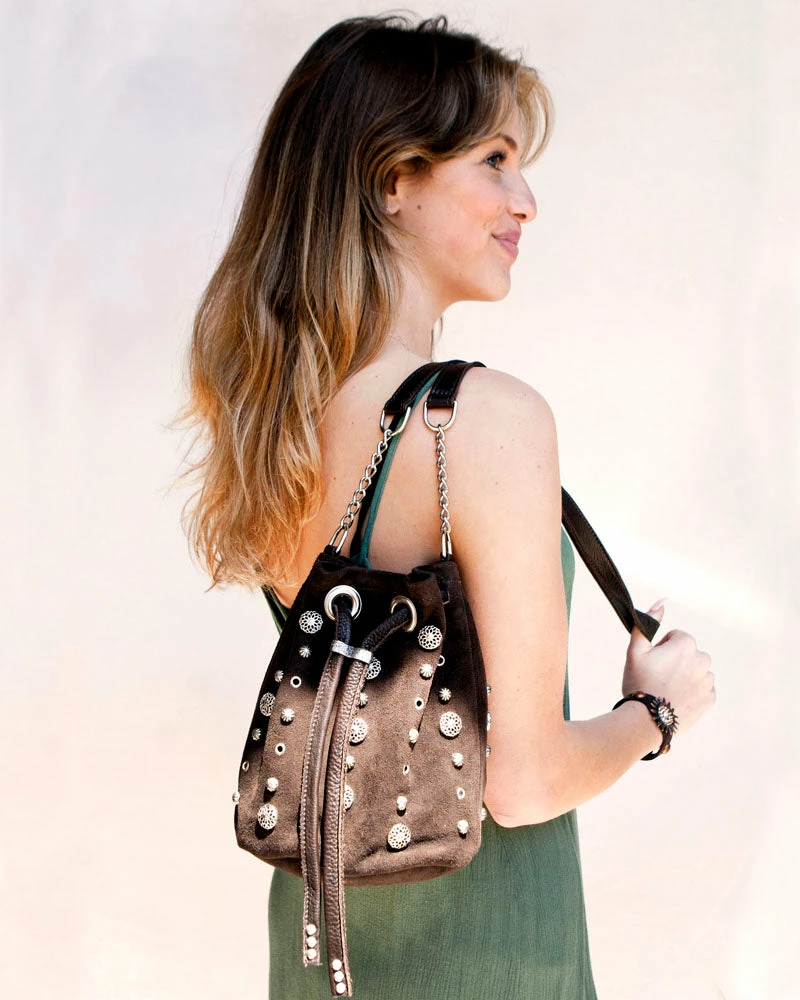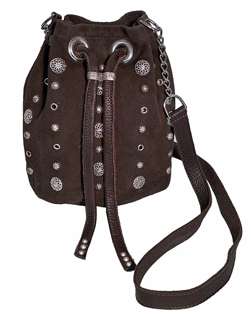 Chocolate Brown suede is dotted with metal stampings, studs, and grommets, topped with a drawstring closure.Â