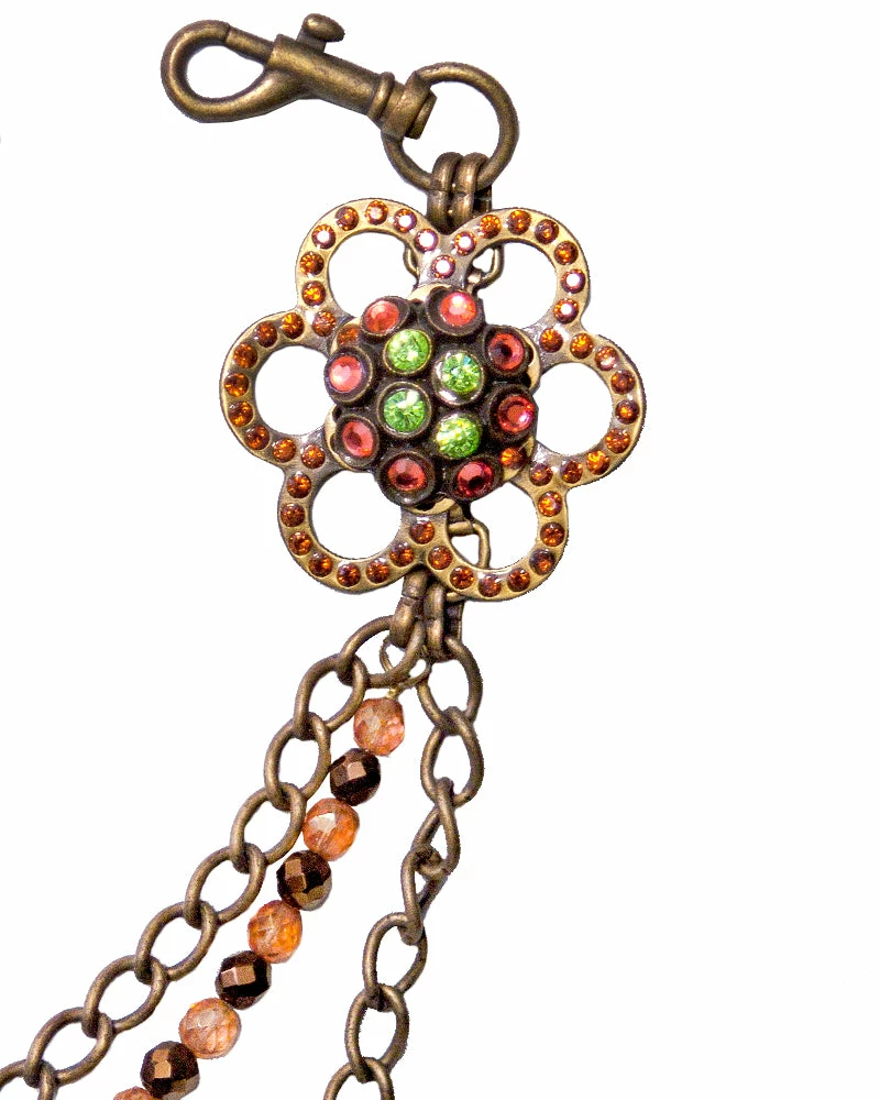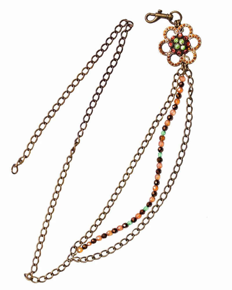 Layers of brass chain and beads meet a cute flower ornament at the end of this vintage style.Â