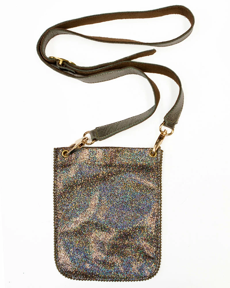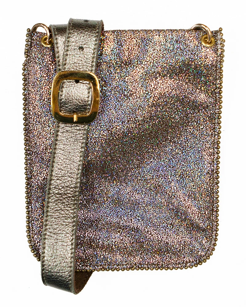 Statement leather makes this style stand out. Shiny hardware and a metallic leather strap adds to the party. This bag also features two inside dividers for added organization!