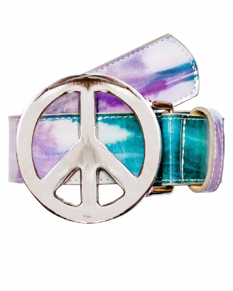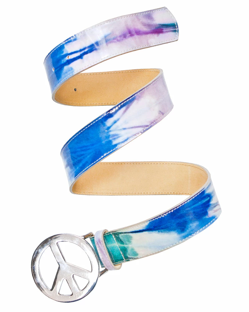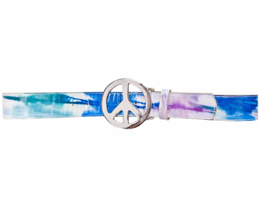 Bring peace, love and cool hippie vibes to your wardrobe with this polished buckle set on a shiny tie-dye leather strap.Â