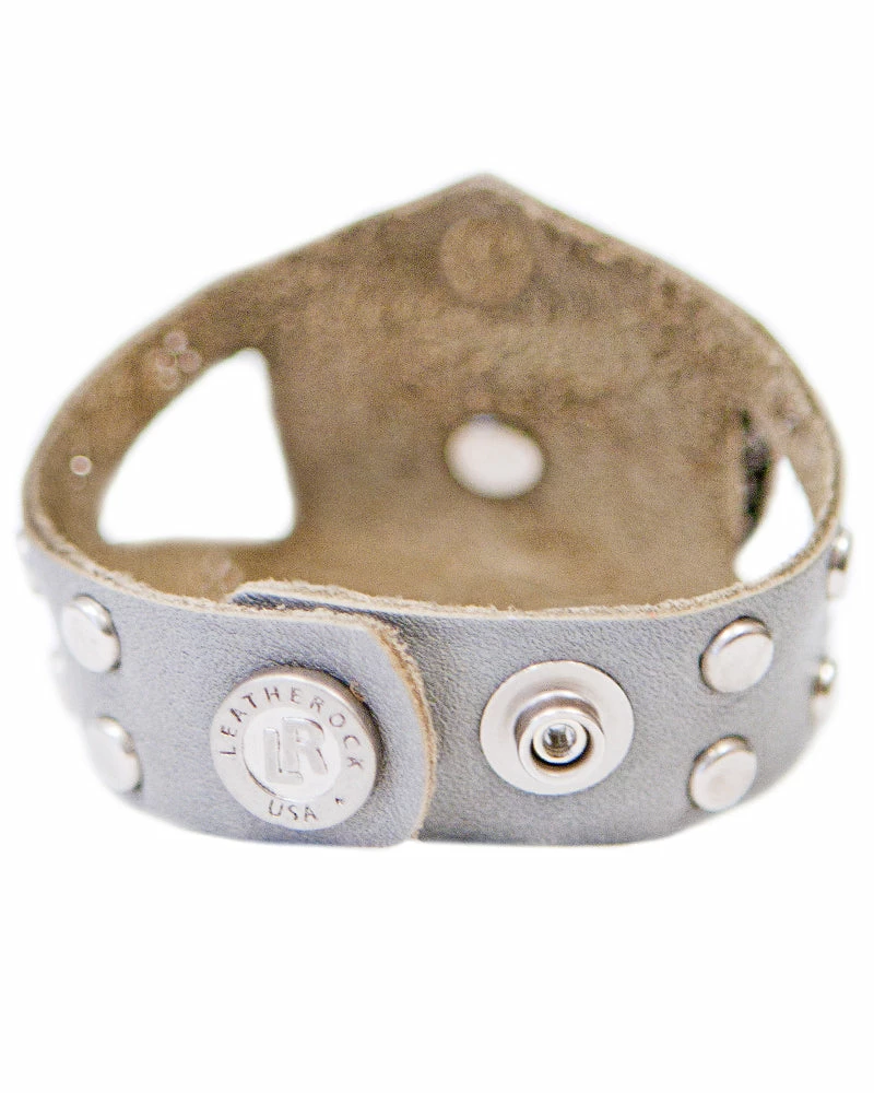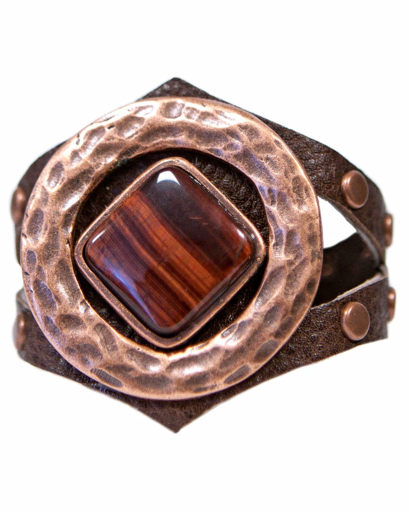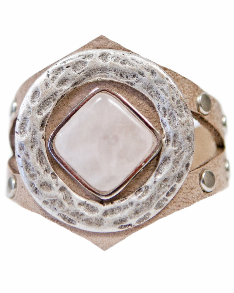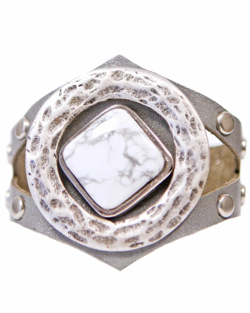 A hammered ring encompasses a bright stone on this studded leather bracelet.