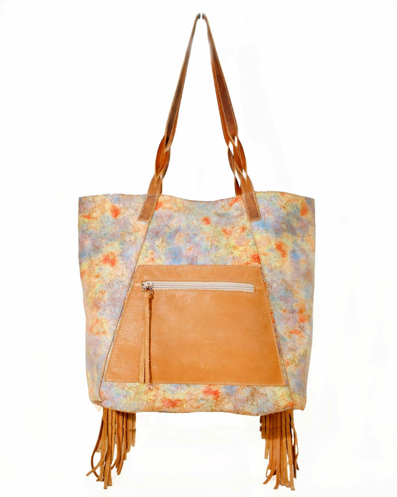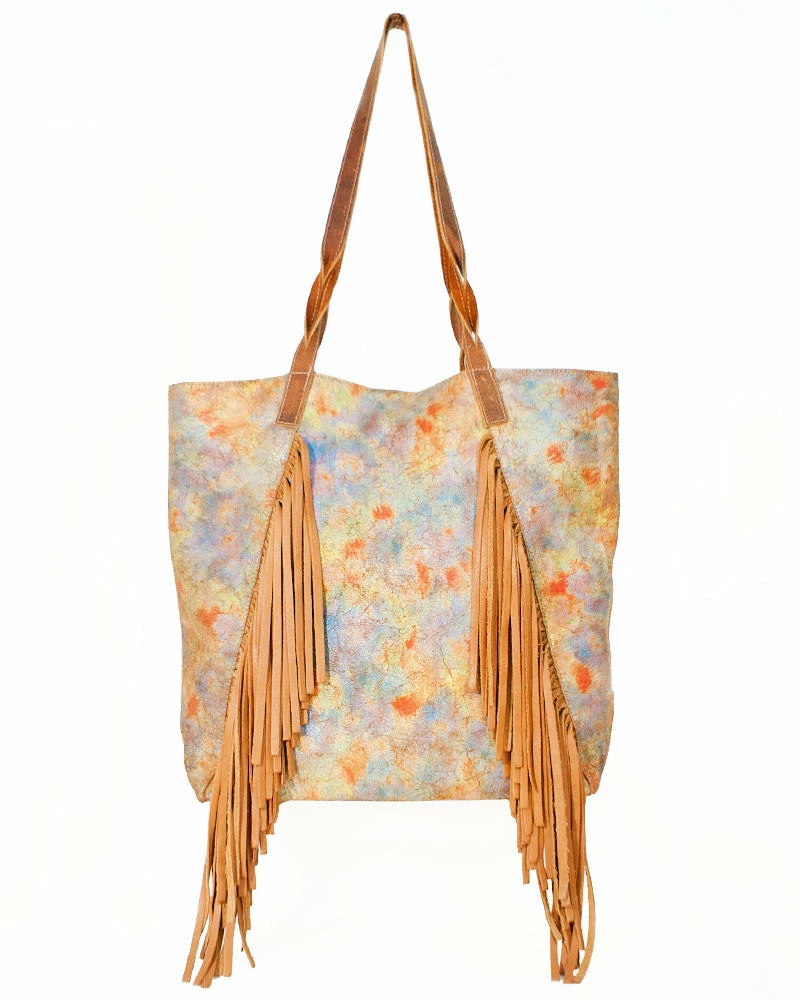 Distressed rainbow leather and soft fringe make this tote bag a fun addition to any look.Â