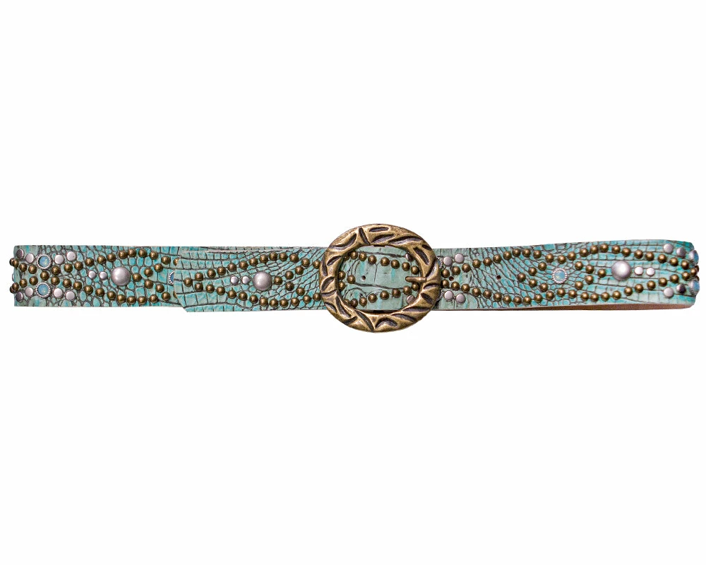 Embossed leather and mixed metal studs make this jean belt stand out.Â