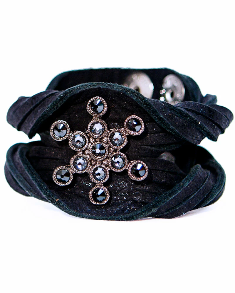 Twisted metallic leather forms the band this snowflake-inspired ornament sits on. Dark crystals add the perfect amount of sparkle.Â